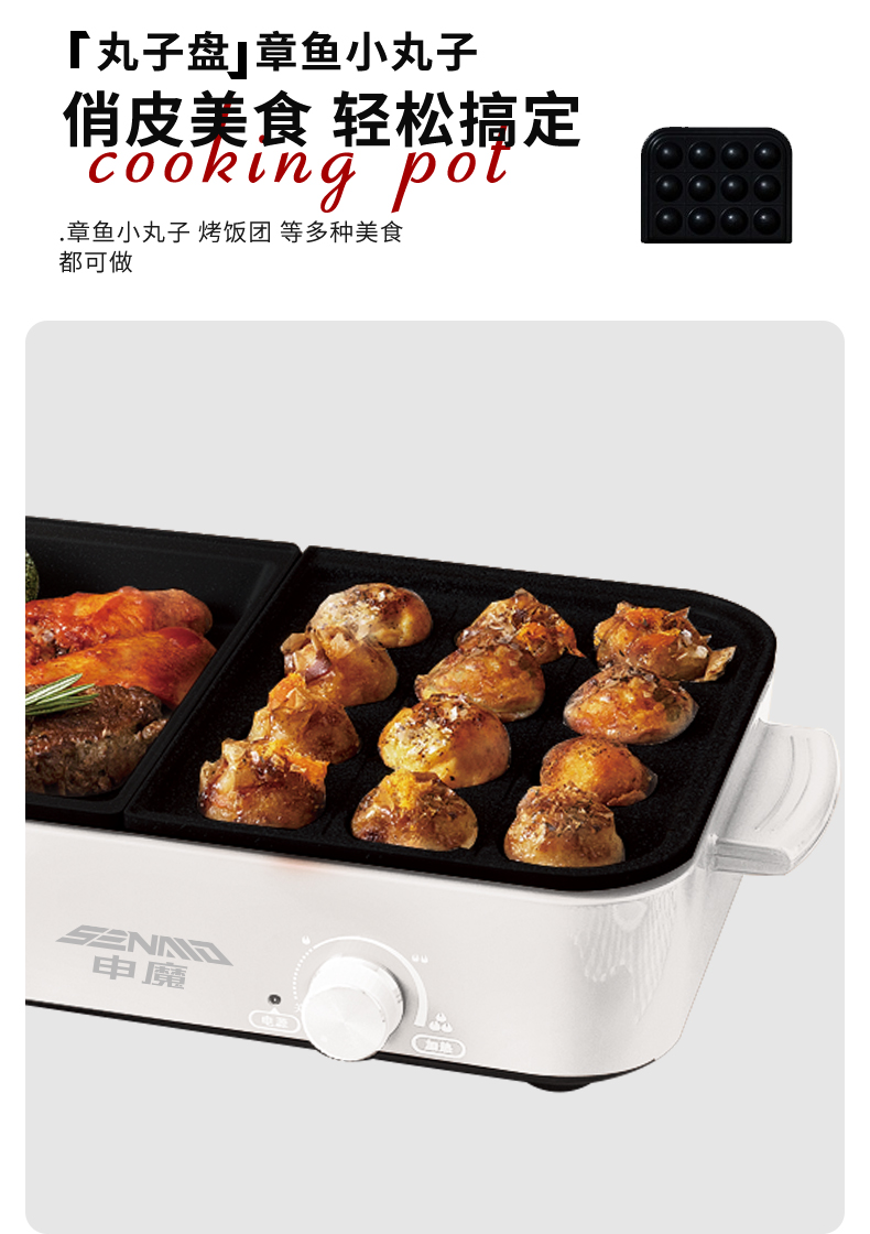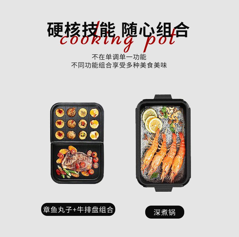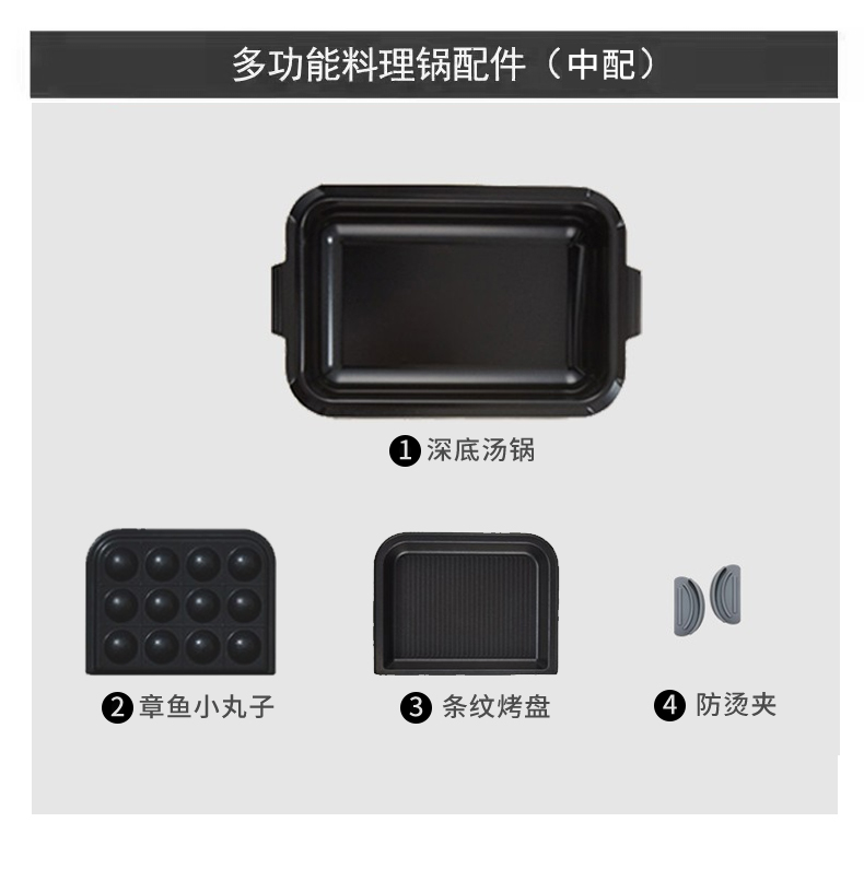 配置:深底汤锅*1,章鱼小丸子烤盘*1,条纹烤盘*1