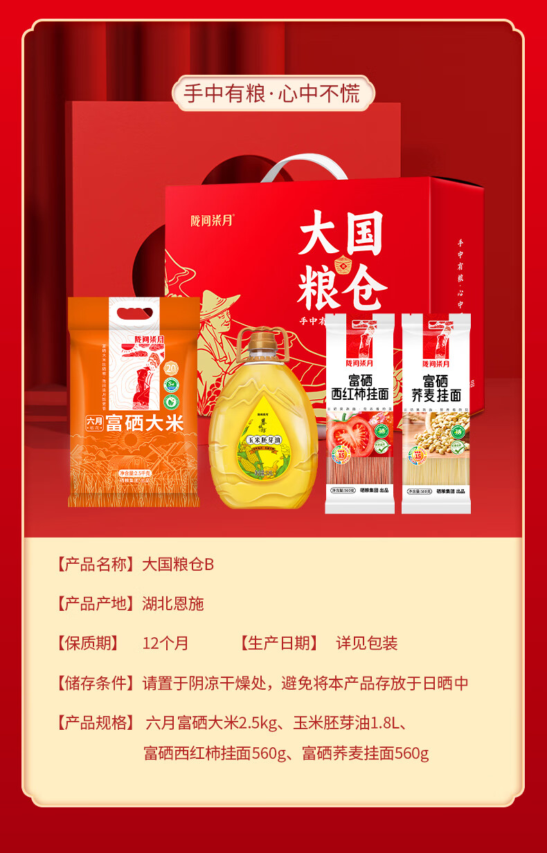 六月富硒大米2.5kg、玉米油1.8L、富硒西红柿挂面560g、富硒荞麦挂面560g