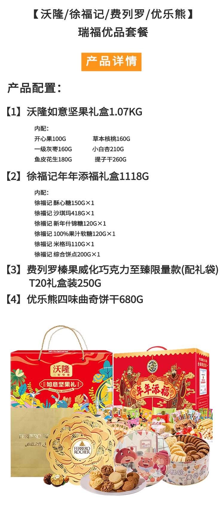 沃隆/徐福记/费列罗/优乐熊-坚果糕点糖果巧克力曲奇饼干瑞福优品组合