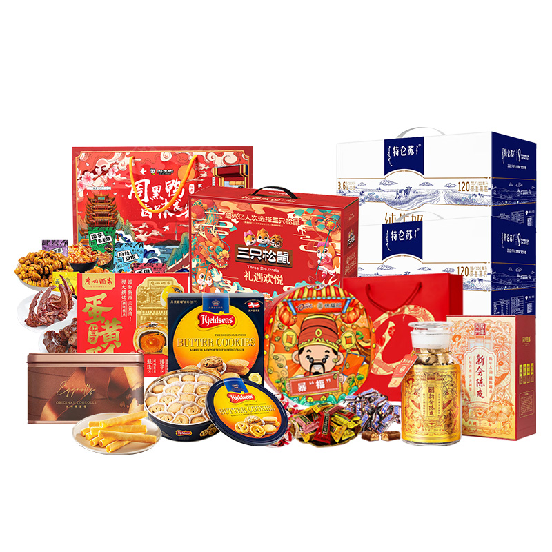 蓝罐/美心/德芙/三只松鼠/周黑鸭/广州酒家/冈州故事/特仑苏-牛奶休食心意福全组合