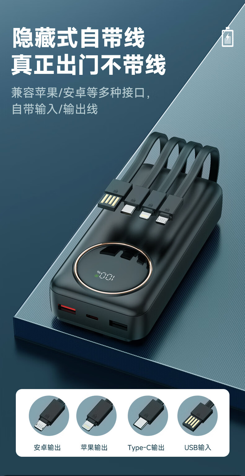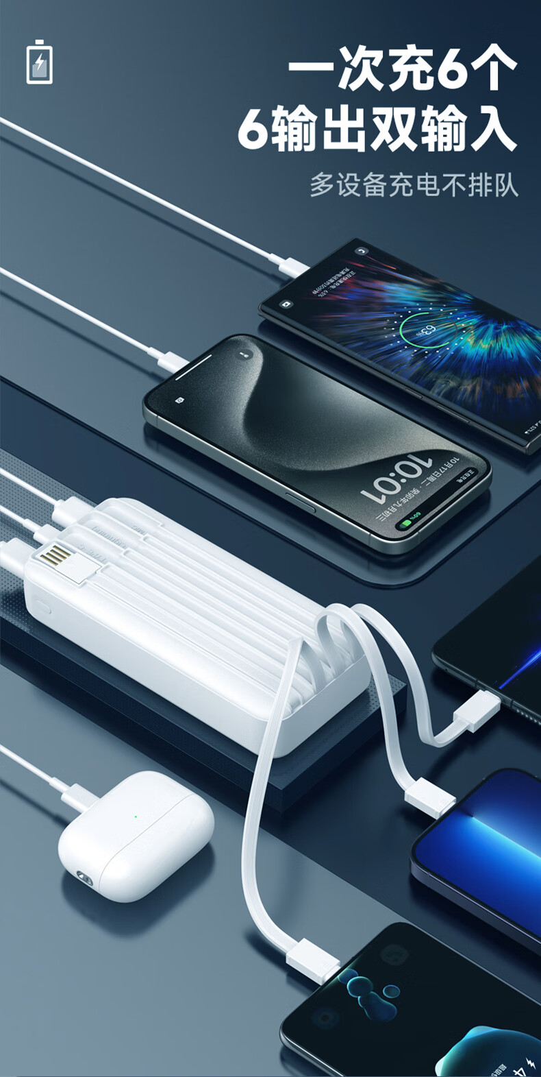 1,同时支持6台手机充电(自带4条线,六输出双输入);