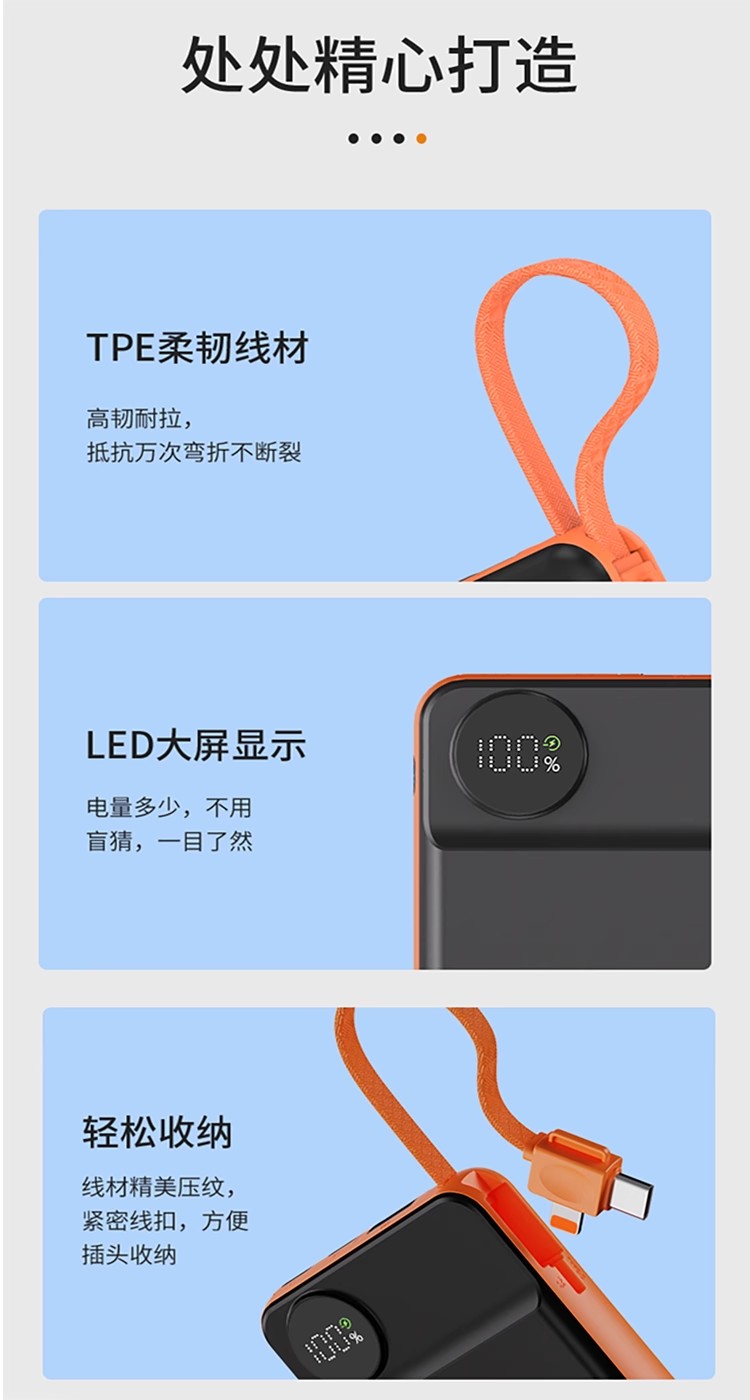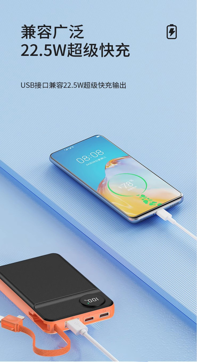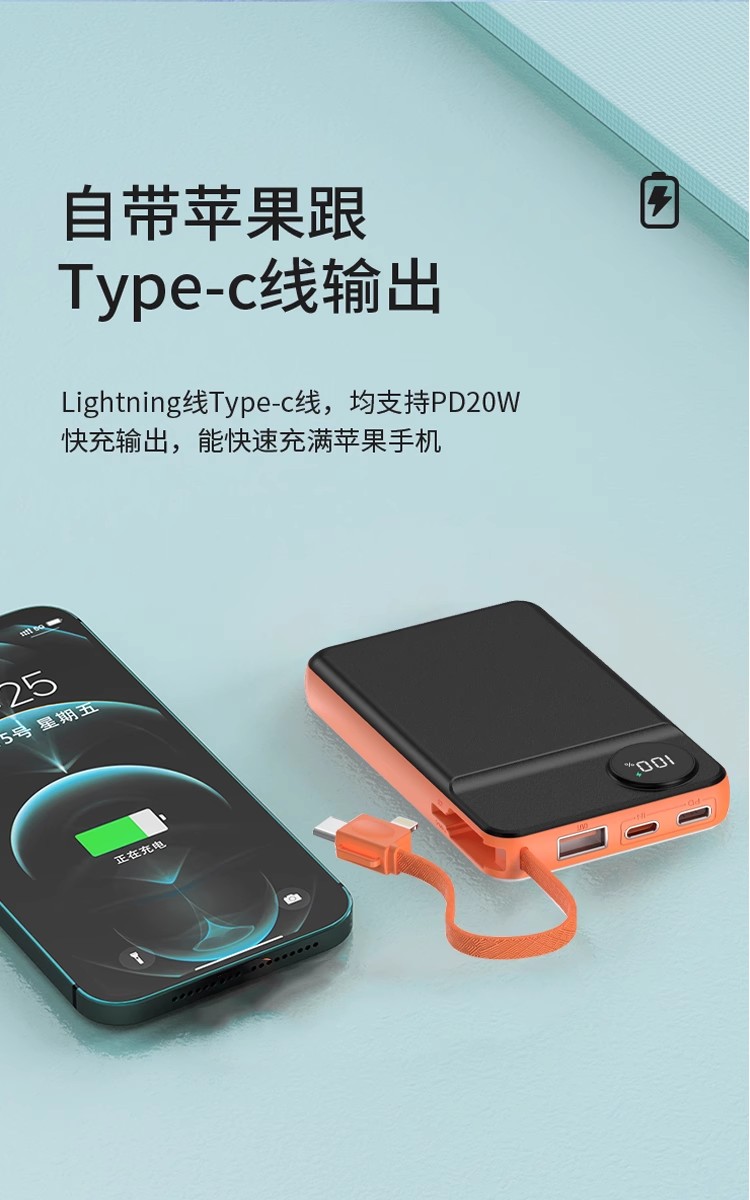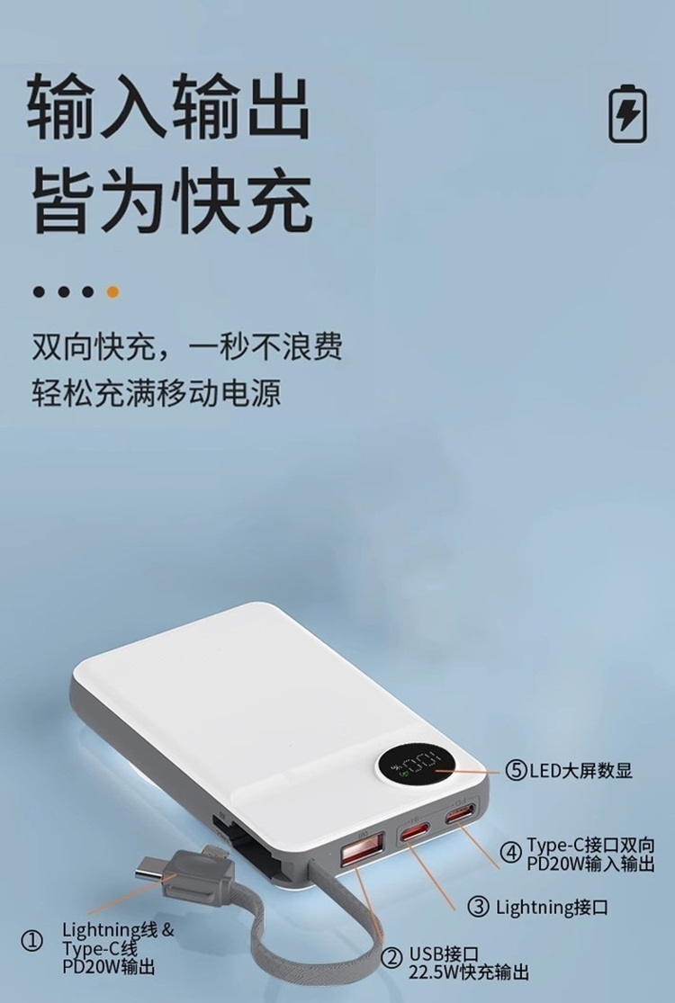 1,自带线支持苹果15,10000毫安,全兼容22.5W超级快充,自带线设计支持PD20W快充; 2,双向快充,一秒不浪费轻松充满移动电源;