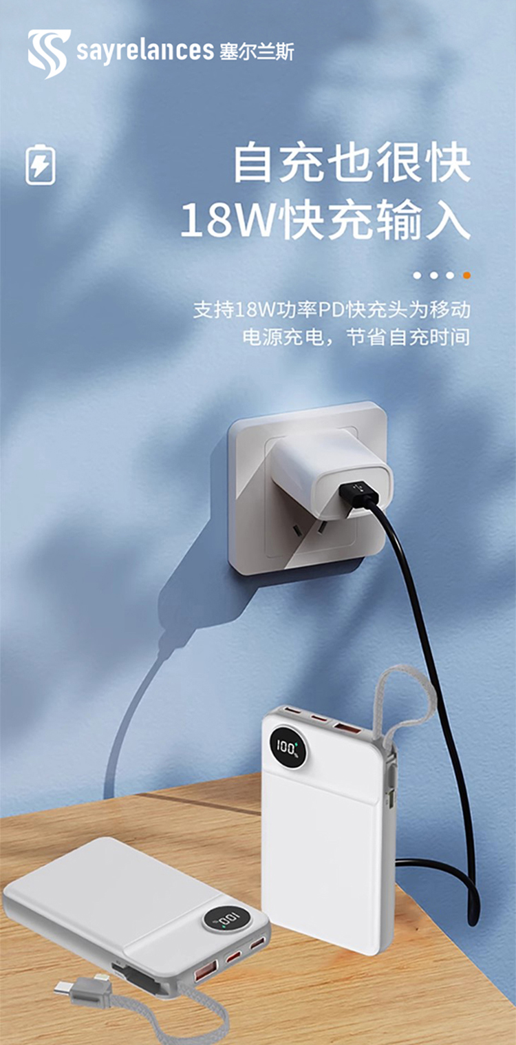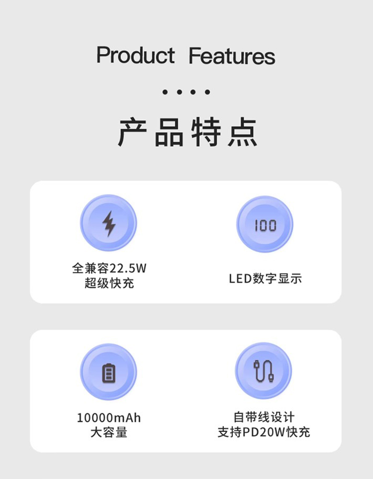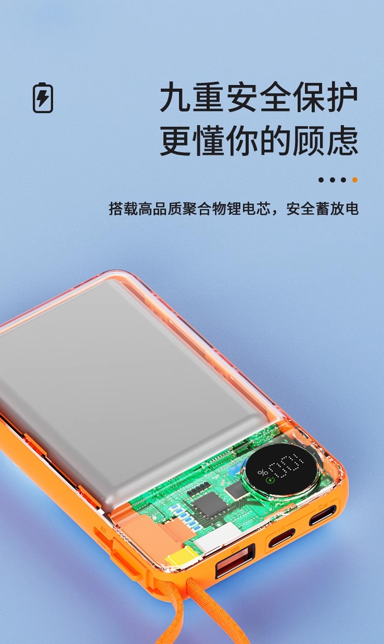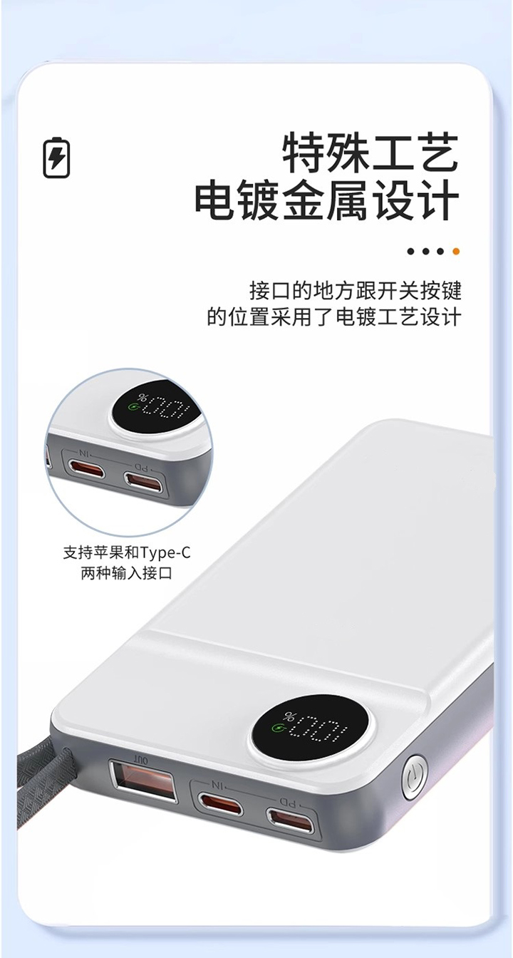 1,自带线支持苹果15,10000毫安,全兼容22.5W超级快充,自带线设计支持PD20W快充; 2,双向快充,一秒不浪费轻松充满移动电源;