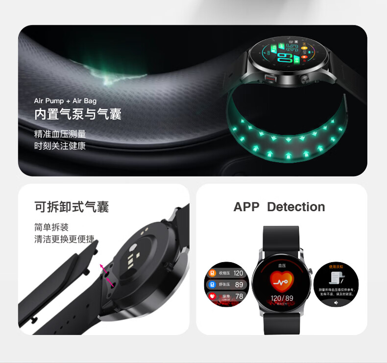 3,可拆卸气囊,简单拆装,清洁便捷,也可以拆卸当普通智能手表使用。