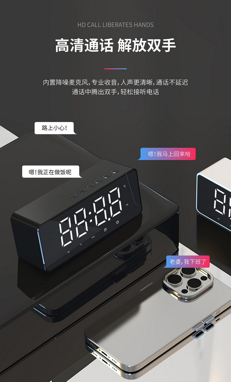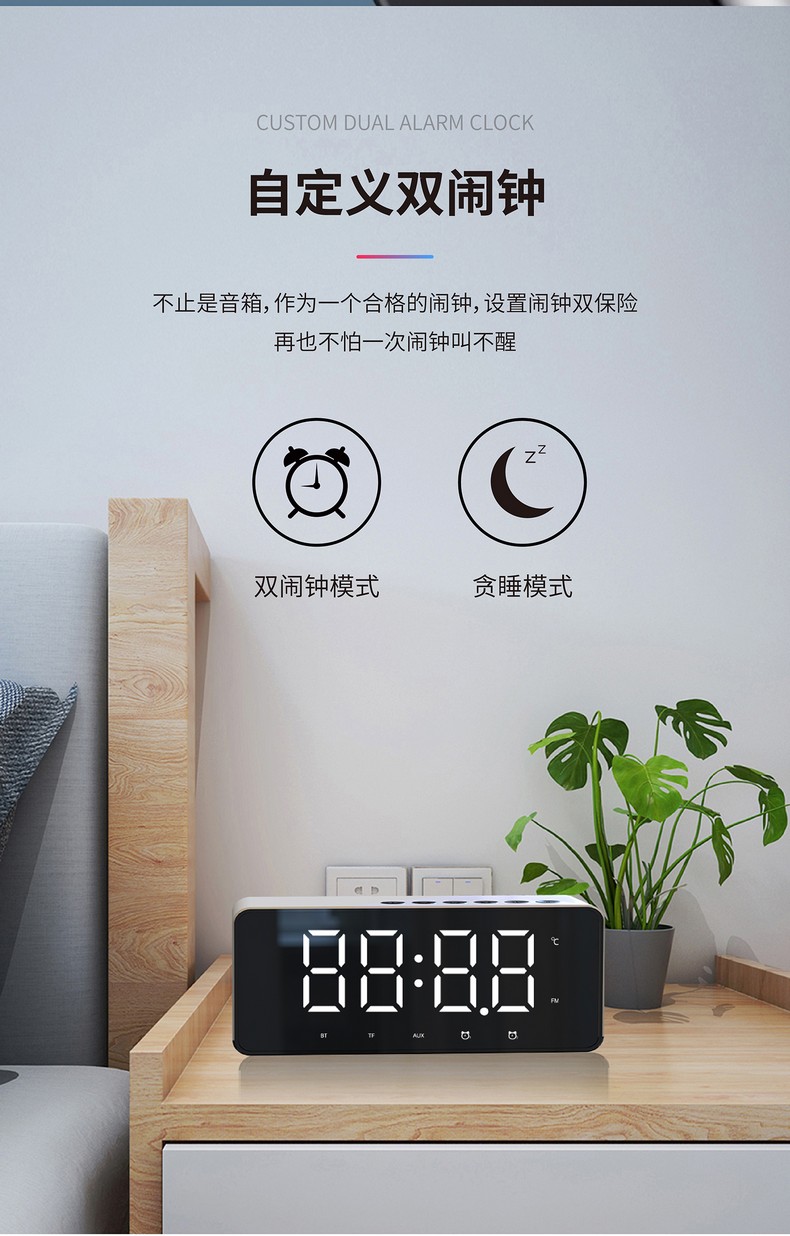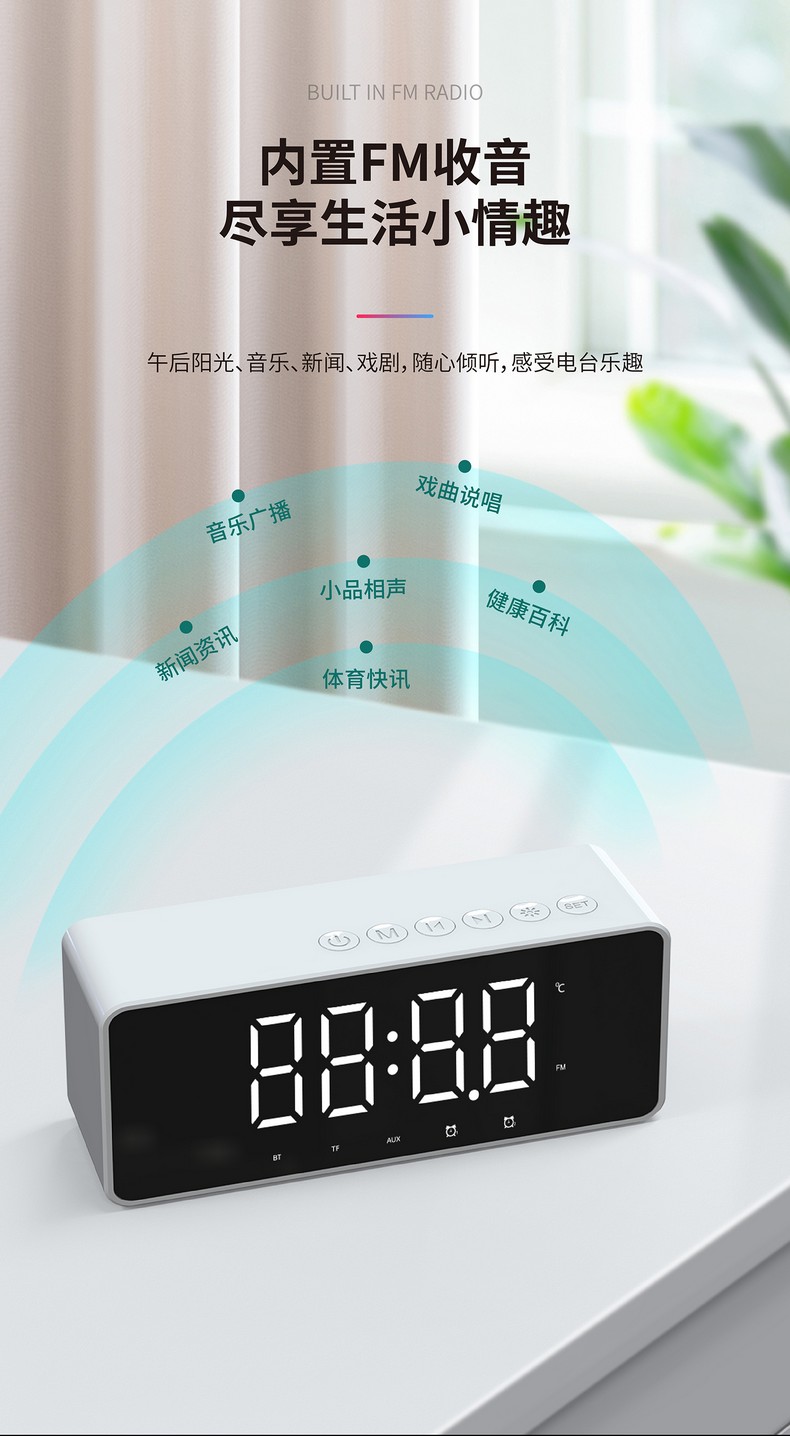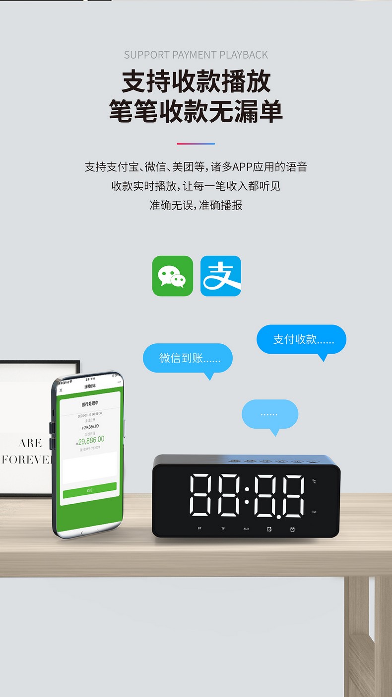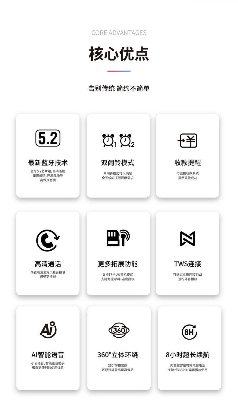 1,支持通话、语视频音聊天,智能降噪通话清晰; 2,闹钟、温度显示、收音机多功能合一,支持TF卡插卡,收款播报;