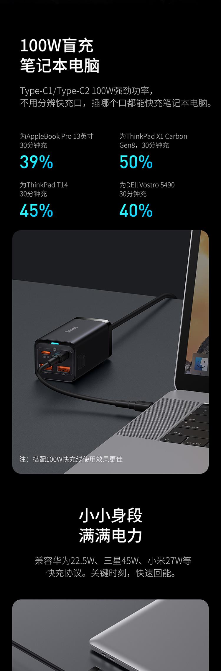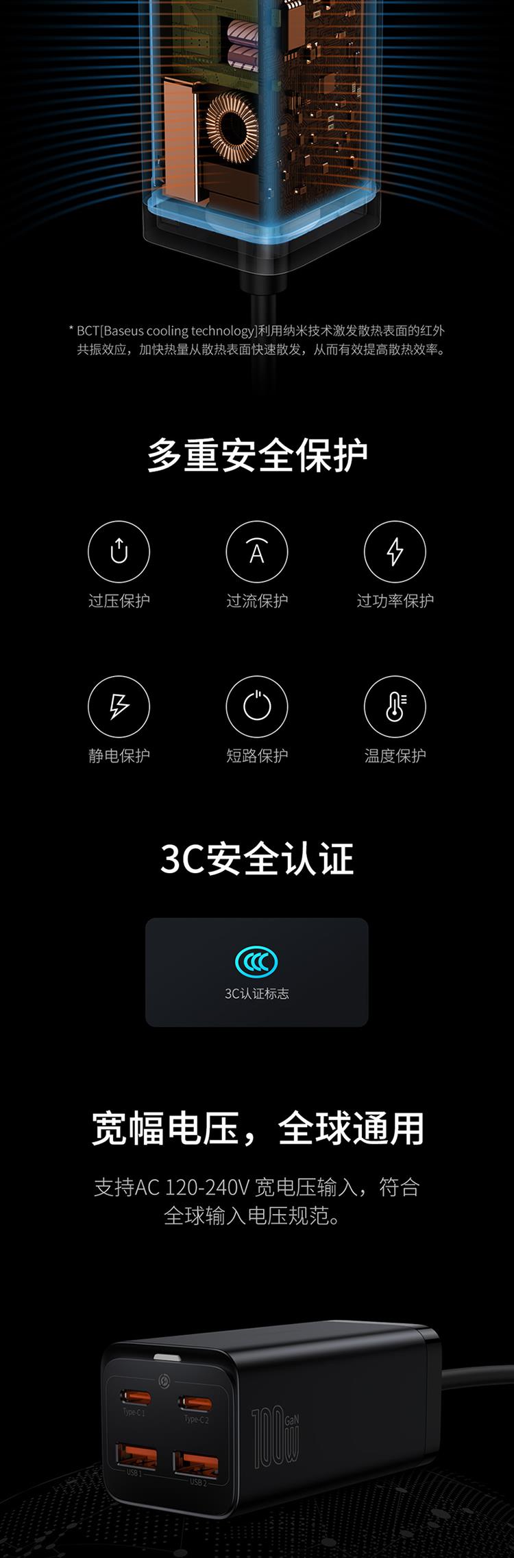 倍思GaN3Pro氮化镓桌面快充充电器2U+2C100W中规黑色 CCGP000001