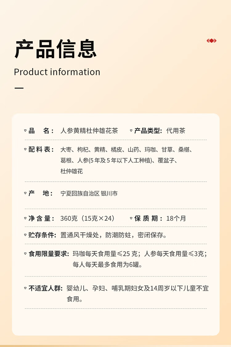 • 北京同仁堂青源堂人参黄精杜仲雄花茶360克(15g×24罐)