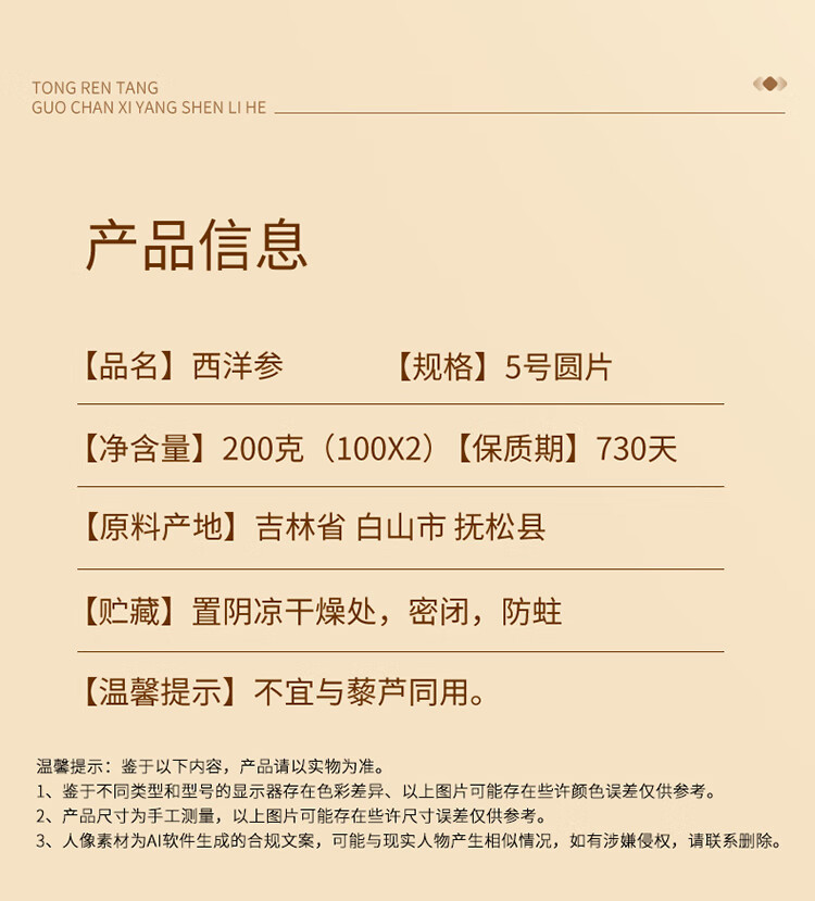 • 北京同仁堂青源堂国产西洋参片 5号圆片1.0-1.2200克(100g*2)