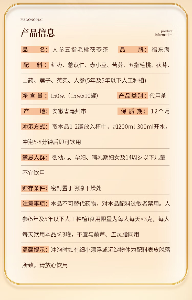 【福东海】人参五指毛桃茯苓茶150克/盒
