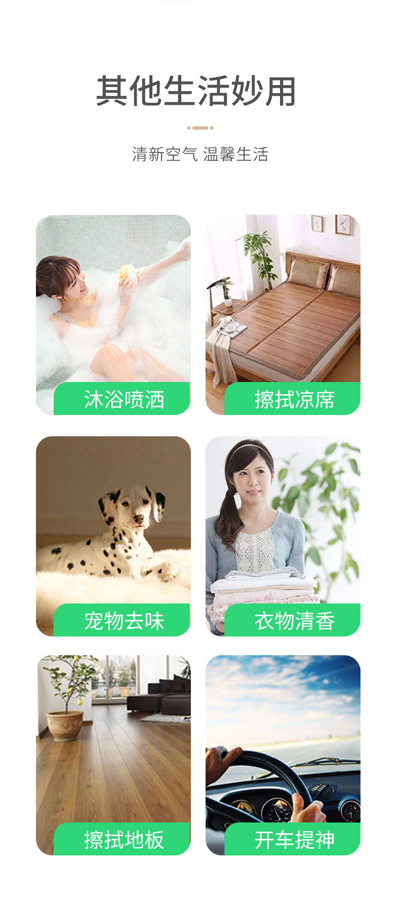 3.多效用途:可涂抹、喷洒或滴入洗澡水,夏季清凉消暑