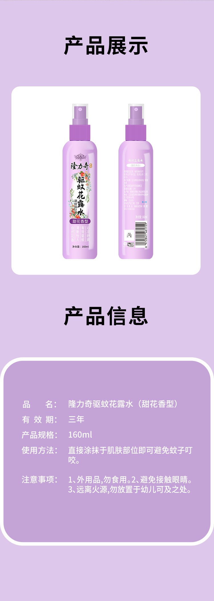 名称:隆力奇甜花香型驱蚊花露水 160ml