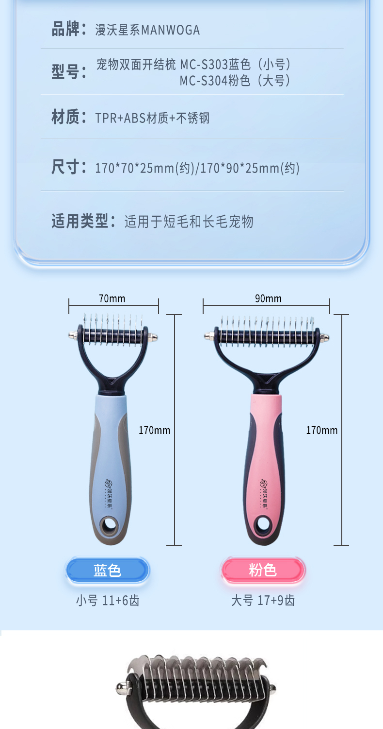 漫沃星系宠物双面开结梳MC-S303蓝色(小号)/MC-S304粉色(大号)