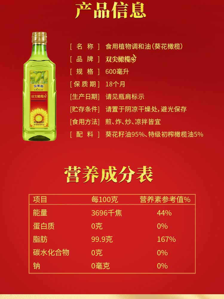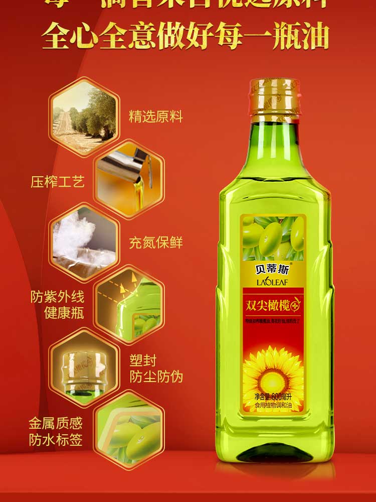 • 贝蒂斯食用植物调和油(葵花橄榄)600ML*1瓶装