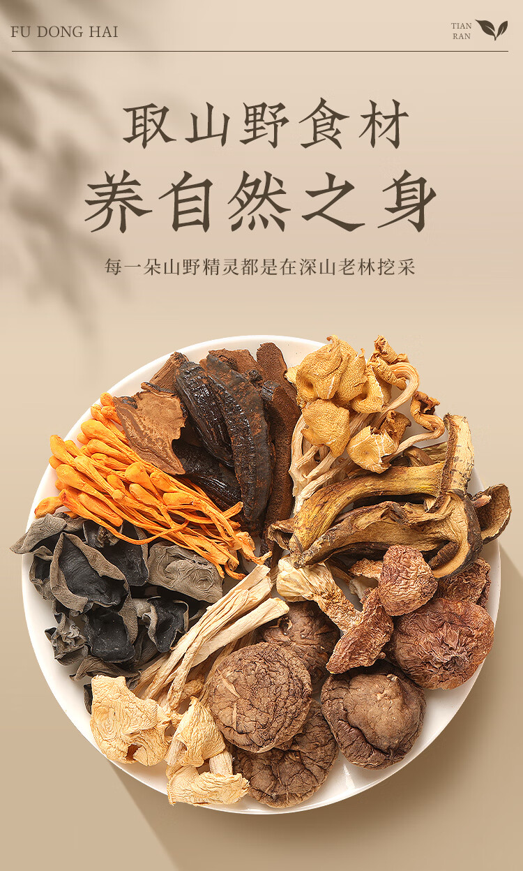 (鸡油黄35克+香菇110克+姬松茸100克+木耳100克+虫草花80克+黑牛肝菌80克+灵芝片70克+白玉菇50克)