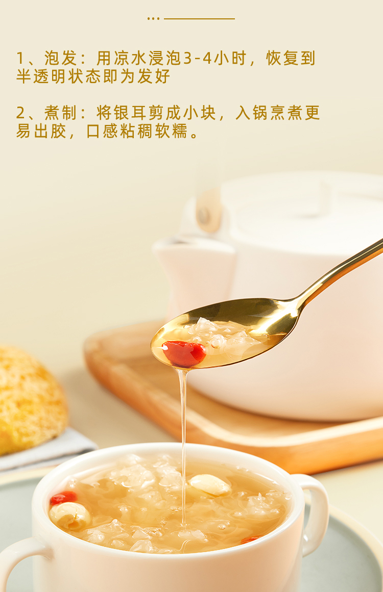 又称糯耳,软糯多胶,清香爽口,易煮易泡发,朵型紧致,小朵银耳,色泽微黄,保留糯耳原本微黄色泽,拒绝熏硫