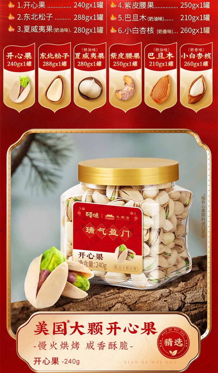 【百草味】开心果240g/【百草味】东北松子 288g/【百草味】紫皮腰果250g/【百草味】夏威夷果(奶油味)280g/【百草味】巴旦木(奶油味)210g/【百草味】小白杏核(奶香味)260g