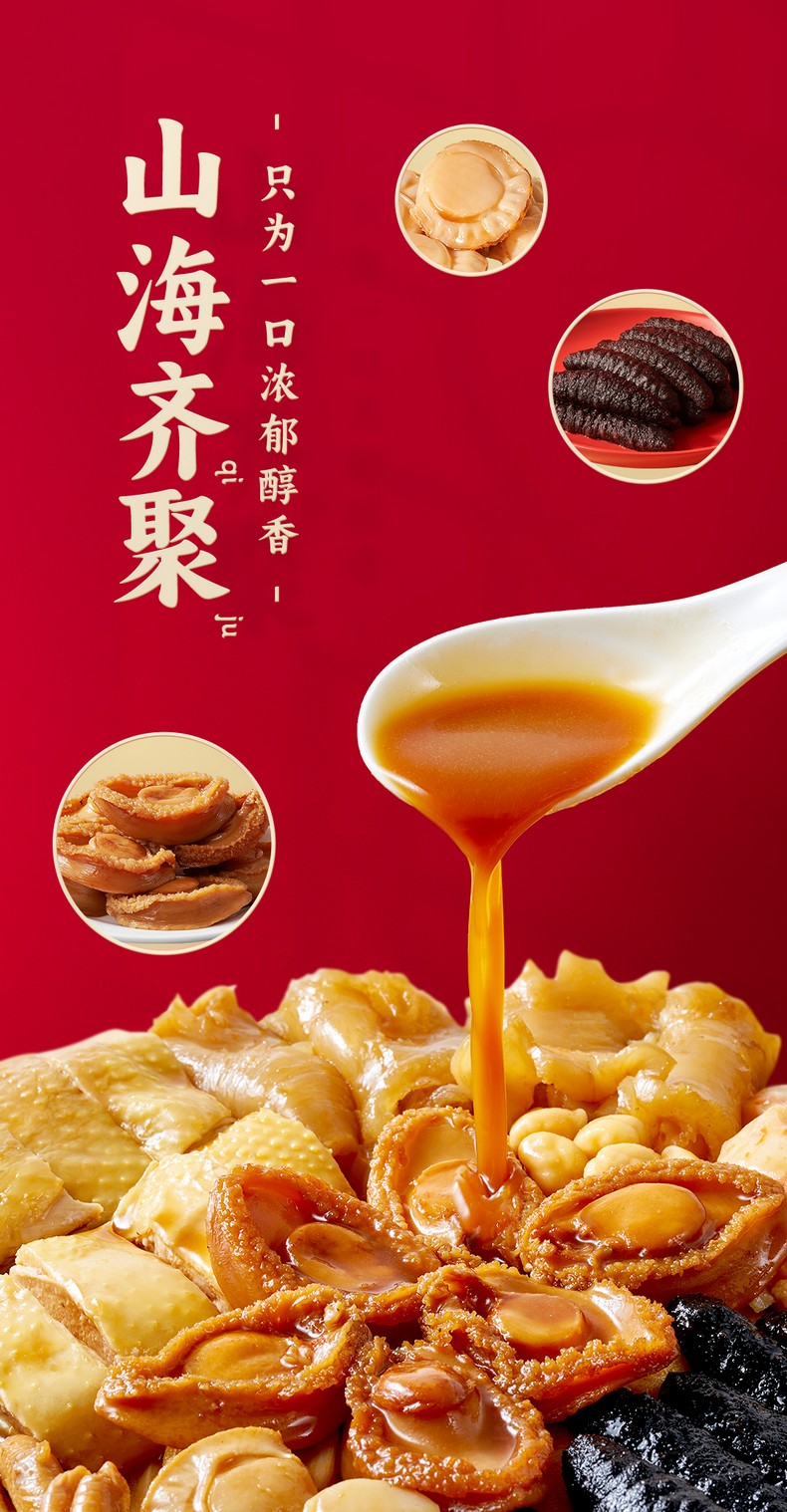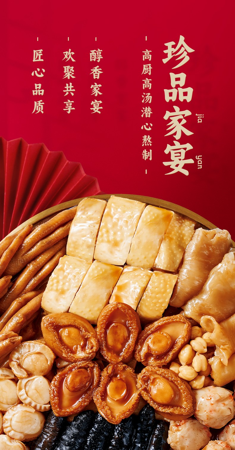 【广州酒家】海参(180-200头)、黄金鲍鱼(14-16克)、蟹鱼胶(30-40头)、帆立贝(40-60头)、卤鸭掌、鱼肉豆腐、仿龙虾丸、三黄鸡肉、花菇仔、莲藕、杏鲍菇、鹰嘴豆、鲍汁