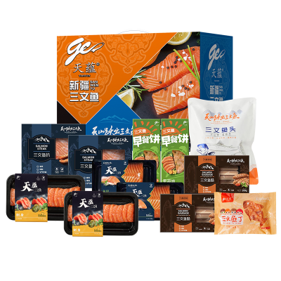 天蕴 三文鱼刺身200g/盒*2 天蕴 带皮鱼段200g/盒*2 天蕴 三文鱼鱼扒210g/盒*2 天蕴 三文鱼鱼头1000g/袋*1 天蕴 三文鱼丁500g/袋*1 天蕴 飞鱼籽味三文鱼肠200g/盒*2 天蕴 三文鱼早餐饼240g/盒*2