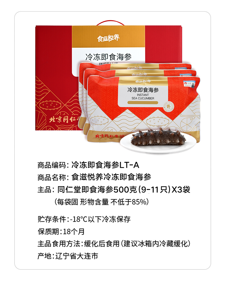 北京同仁堂冷冻即食海参3斤装/箱 9-11头/500g*3袋/箱