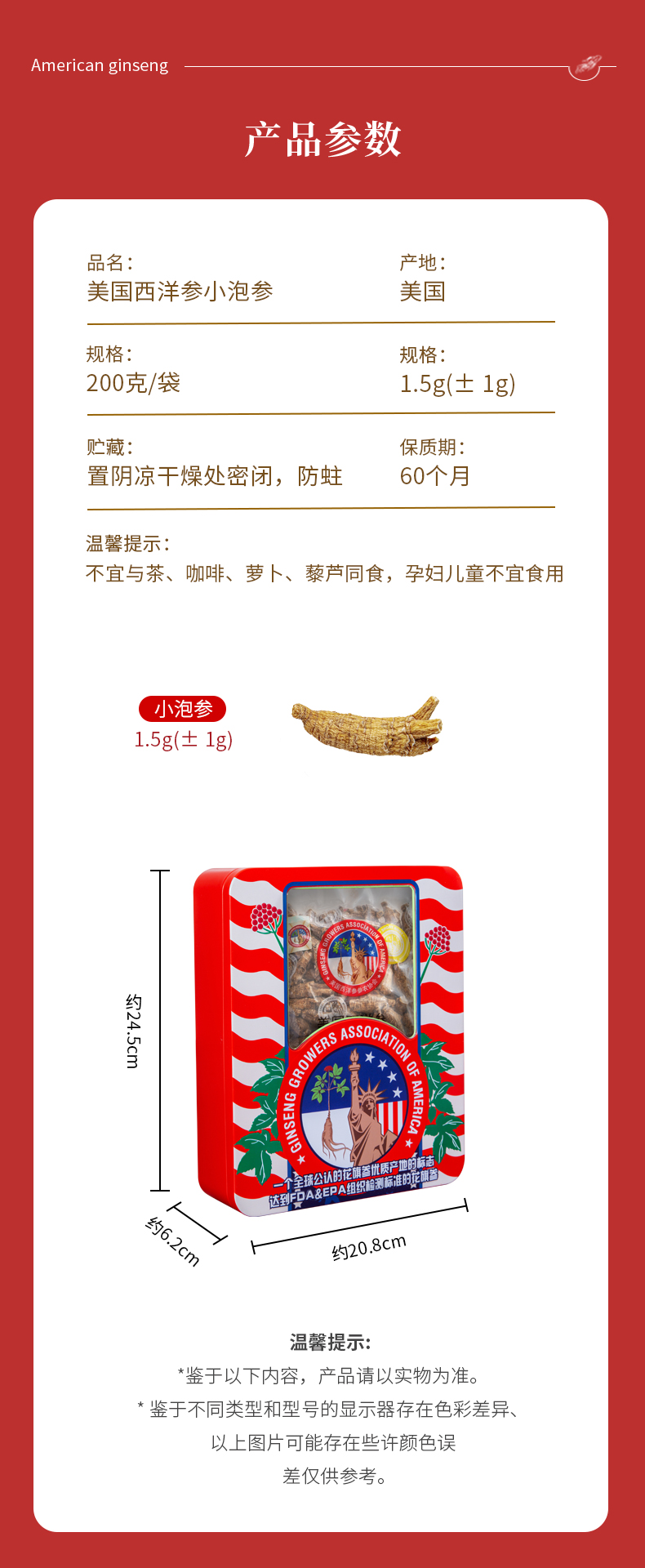 美国西洋参参农协会小泡参1.5g(±1g)200克/盒