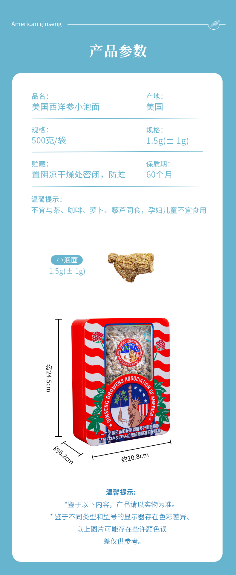 美国西洋参参农协会小泡面1.5g(±1g)500克/盒