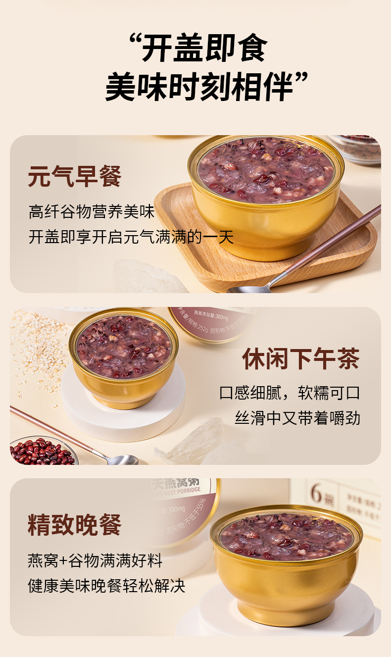 1.高膳食纤维搭配牛奶,营养燕窝,口感有层次 2.低脂肪,低热量,高营养。配料纯0添加,0色素,0防腐剂 3.保留食材本味与营养,独立包装方便便携。