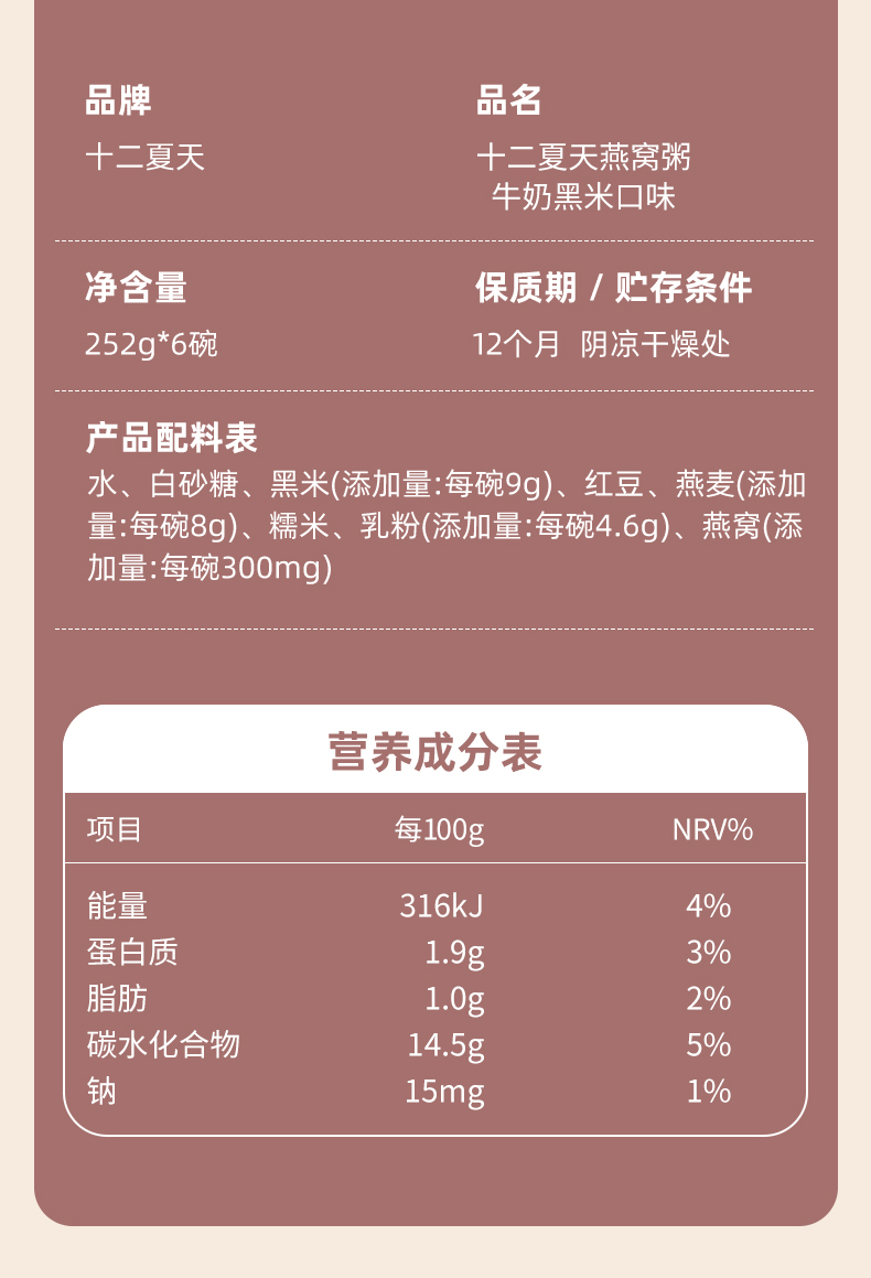 十二夏天燕窝粥黑米牛奶口味 252g*6碗/盒