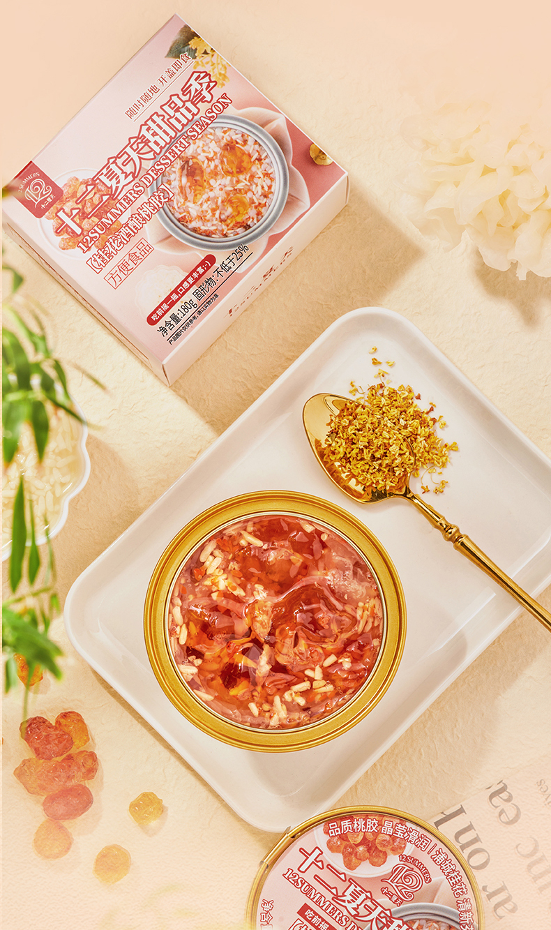 十二夏天甜品季【桂花酒酿桃胶】—— 以东方美学焕新传统甜品,当山野桃胶邂逅古法酒酿的清香甜美,加上蒲城桂花、福建古田银耳和湖北魔芋米等优质食材锁鲜炖煮,东方颐养食材与轻奢甜品灵感碰撞——打破传统糖水边界,让滋养化作舌尖的风雅享受。