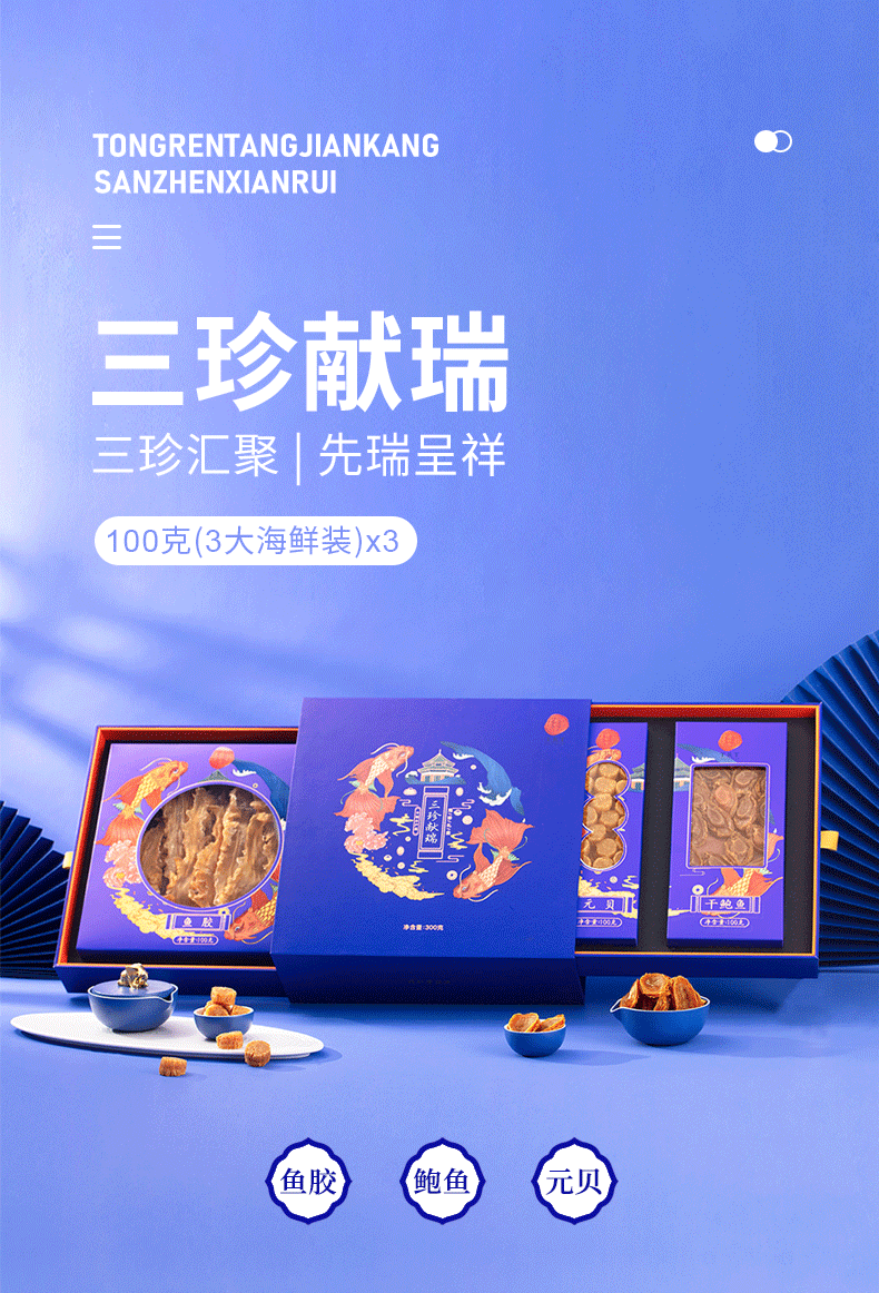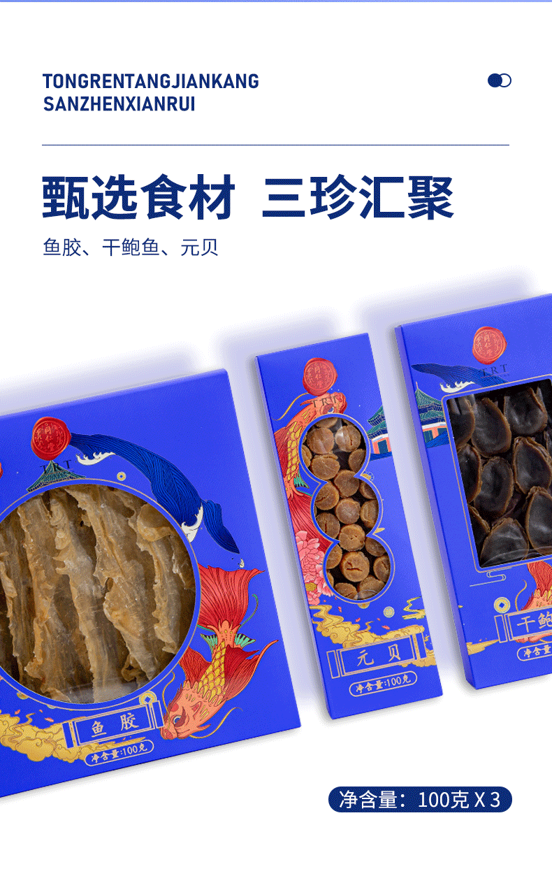 北京同仁堂三珍献瑞300克(元贝100克、鱼胶100克、干鲍鱼100克)