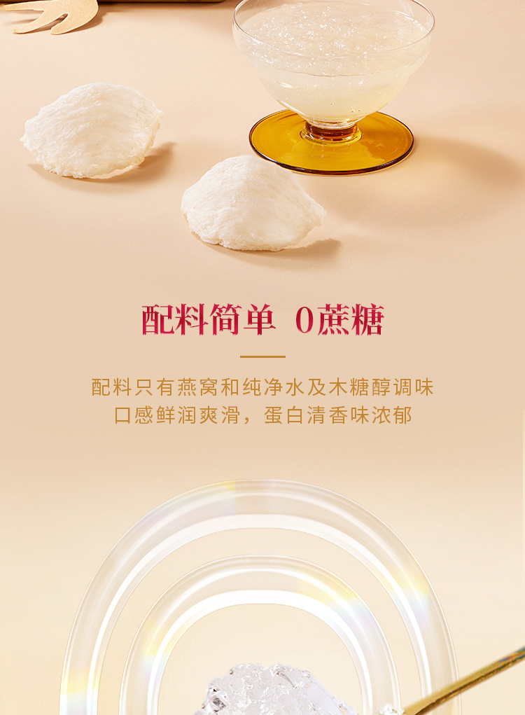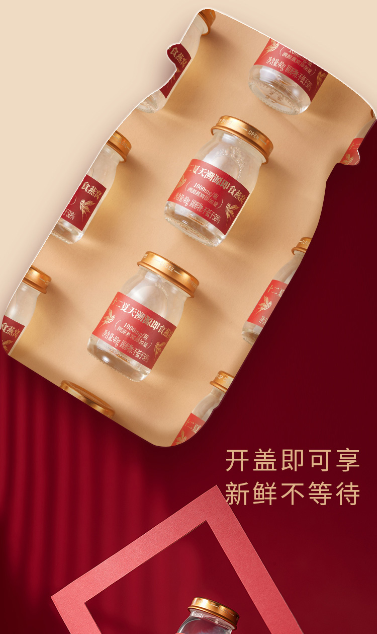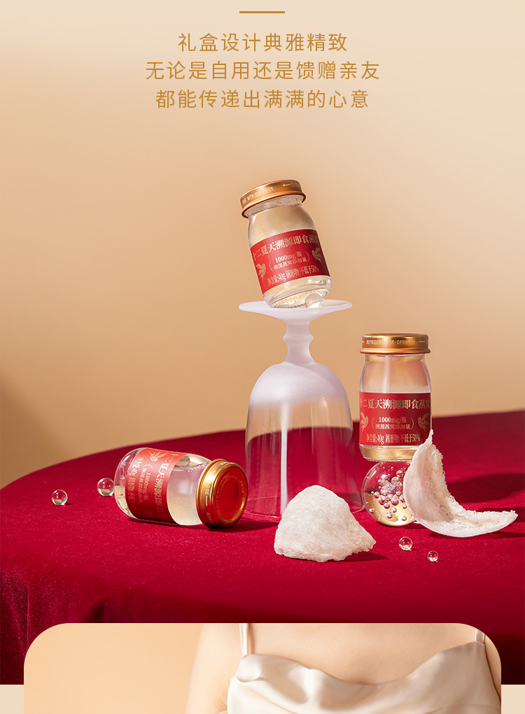 每一瓶即食燕窝均配有中国检验检疫科学研究院认证的CAIQ溯源码,这不仅是对其“合法身份”的证明,更是对原料进口安全和纯粹性的坚定承诺。礼盒设计典雅精致,红色基调配以暗纹与烫金工艺,彰显品牌的低调奢华与优雅。无论是自用还是馈赠亲友,都能传递出满满的尊贵与心意。内嵌独立瓶装燕窝,一盒12瓶,每瓶蕴含1000mg印尼溯源进口燕窝,固形物含量高达50%以上,真材实料,每一口都能感受到燕窝的细腻与浓郁。