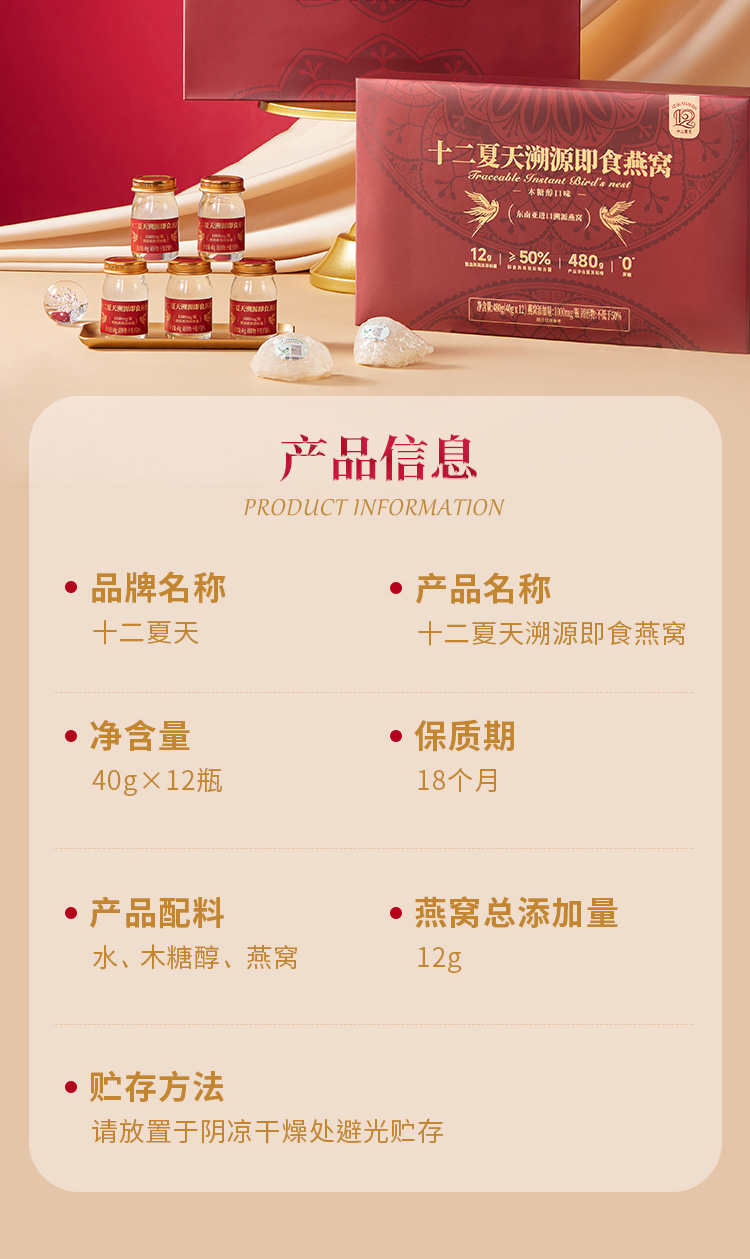 十二夏天溯源即食燕窝-木糖醇口味40克/瓶,12瓶/盒