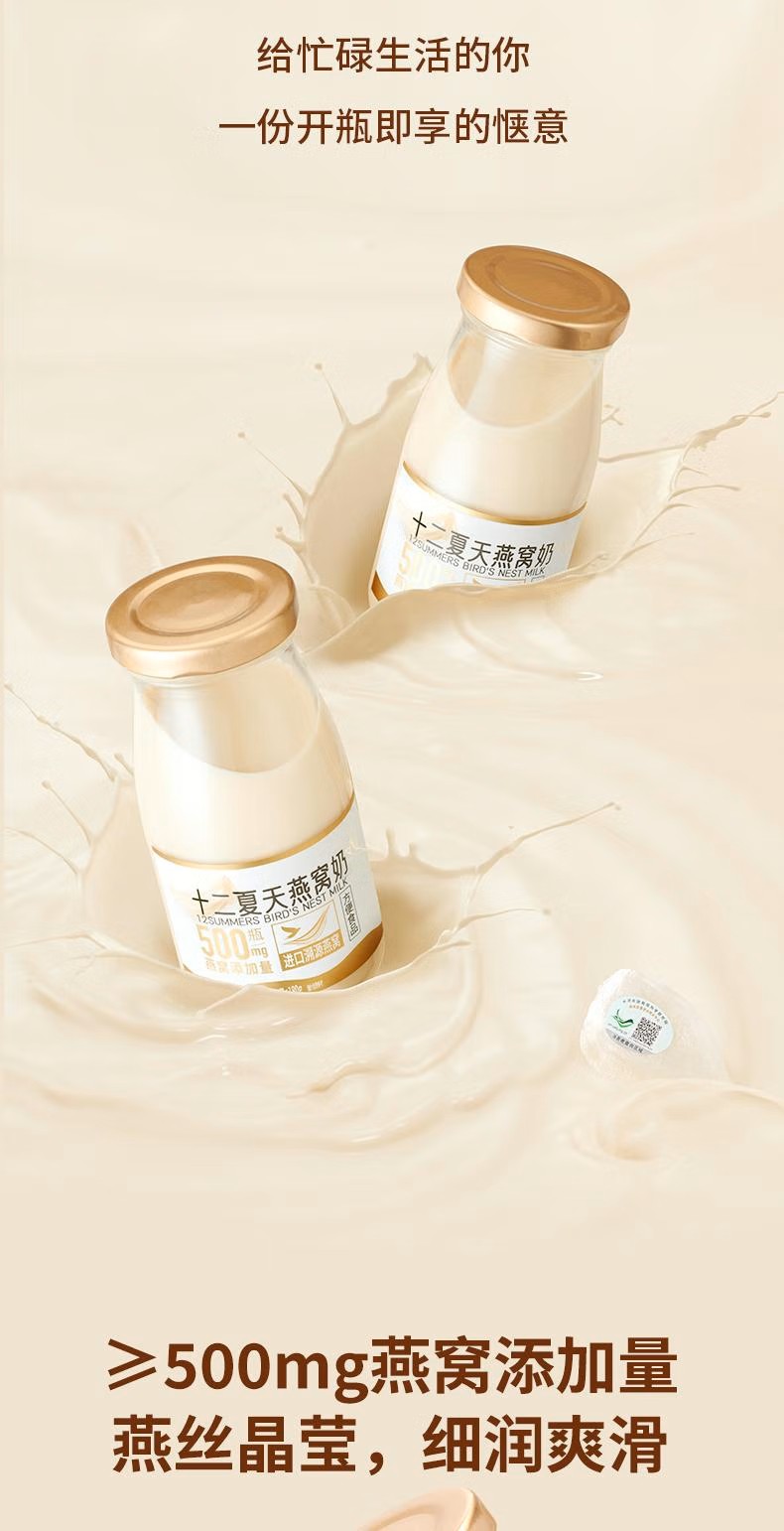 选用印尼进口的燕窝和优选牧场奶源,传递源头的新鲜滋味。每瓶投料500mg干燕窝,燕丝晶莹分明,细润爽滑,生产过程中不添加任何化学添加剂和人工色素,仅以冰糖调味,每一滴都凝聚着大自然的精华,为你带来最纯粹、天然的滋养体验。
