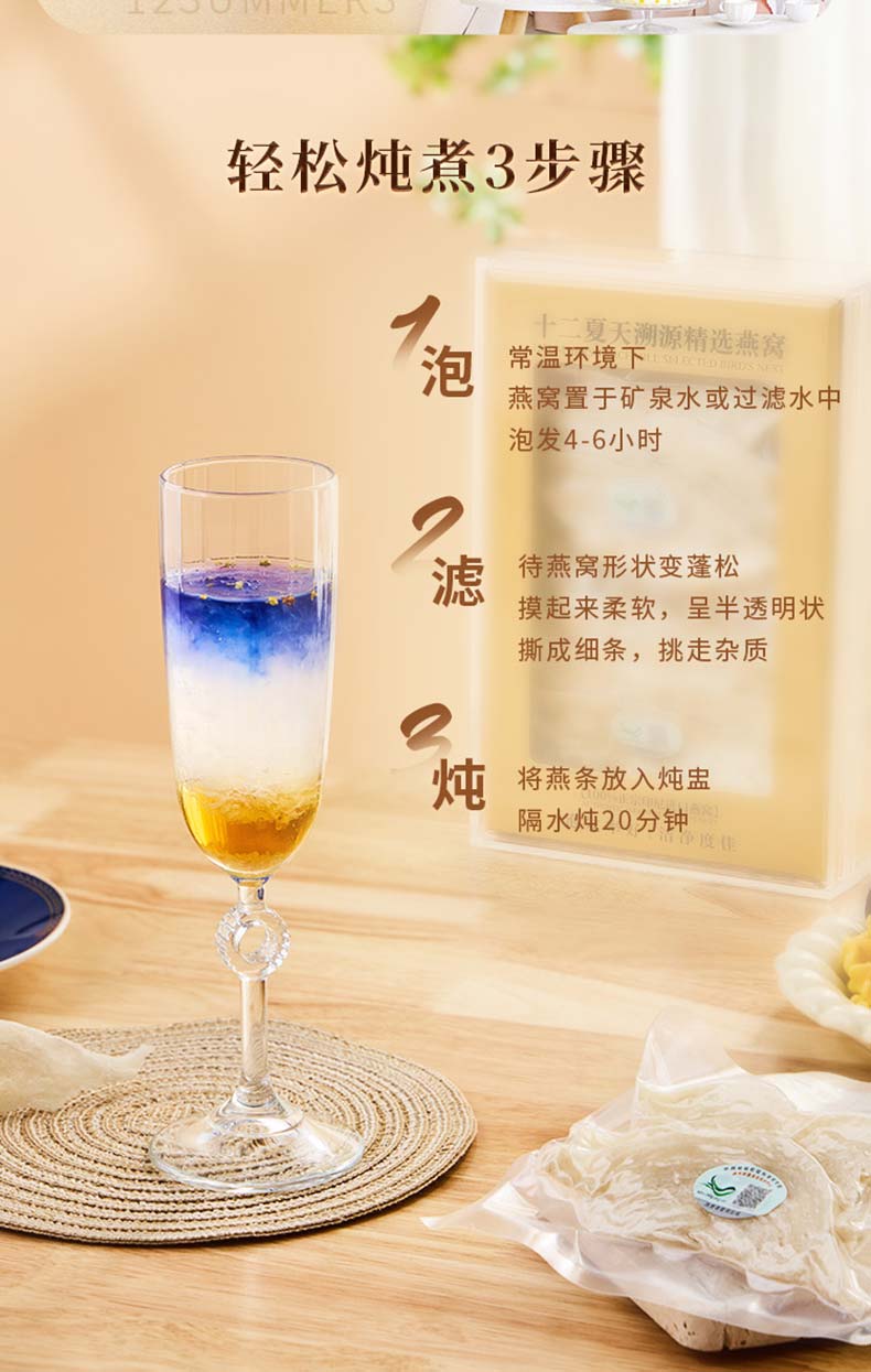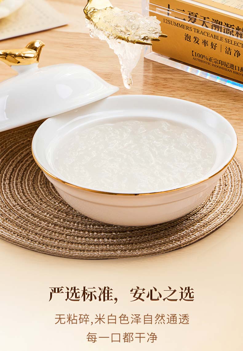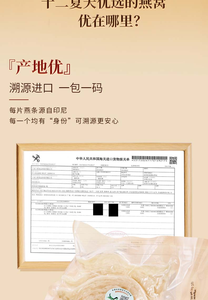 每片燕盏都源自印尼与马来西亚的自然馈赠,我们承诺,每一盏燕窝均为原产地直采,严格遵循自然法则,拒绝任何化学干预——0刷胶、0漂白、0添加,纯粹如初,100%纯天然品质保证。中国检验检疫科学研究院溯源码认证,一盏一码,每一盏都有独一无二的合法身份证,溯源保障、安心滋补。泡发出后的燕窝晶莹剔透、燕丝分明。