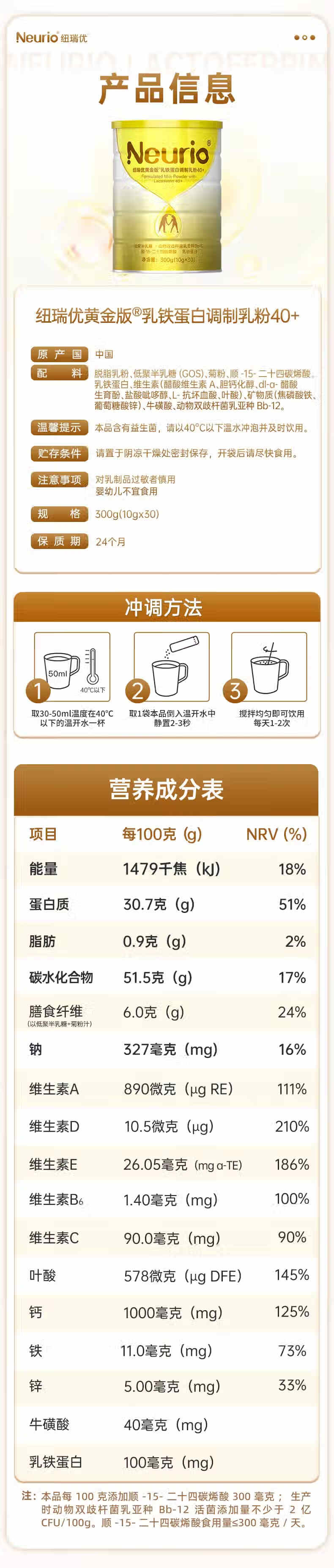 纽瑞优Neurio®黄金版高钙乳铁蛋白调制乳粉300g 40+pro *2罐(礼盒装)(价格需找经理询价)