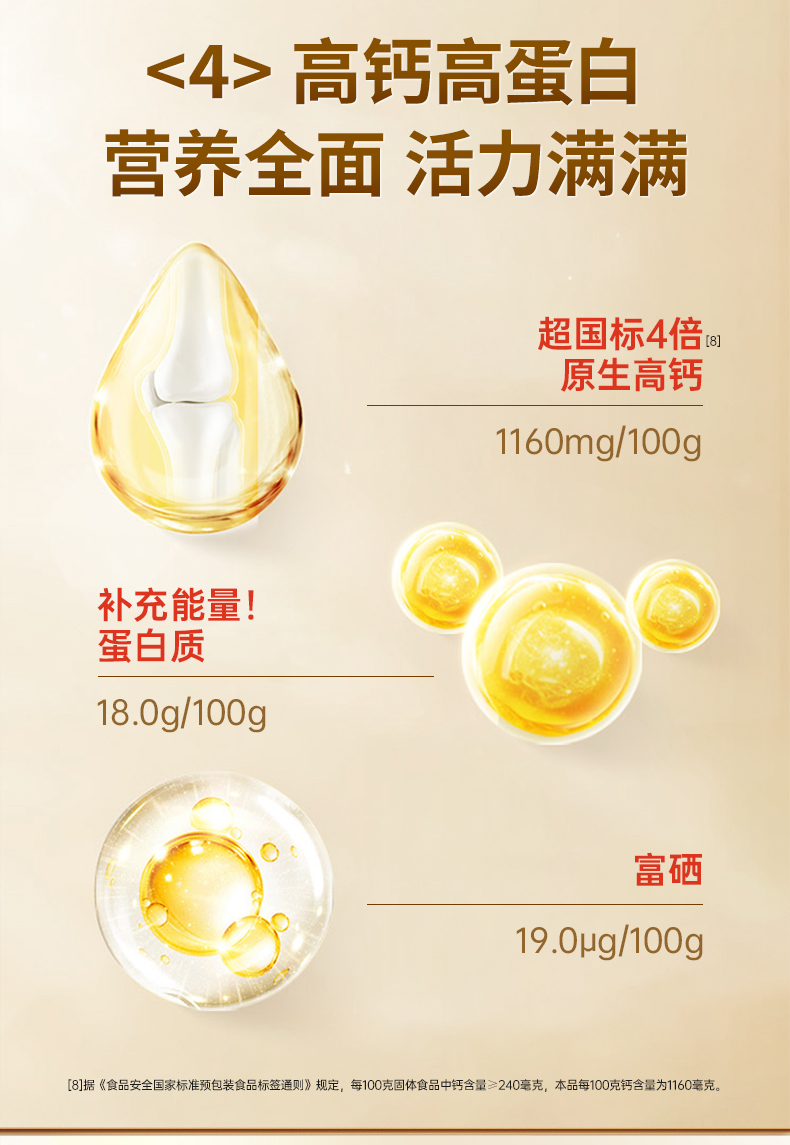 3、超国标4.8倍高钙含量,每100g含钙1160mg