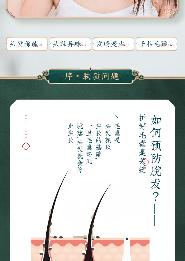 含有有效的抗脱发成分,能够减少脱发现象,强化发根,促进头发生长,防止进一步脱发。"