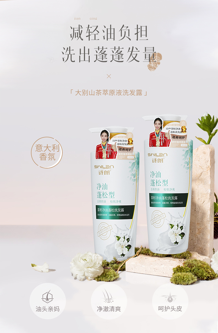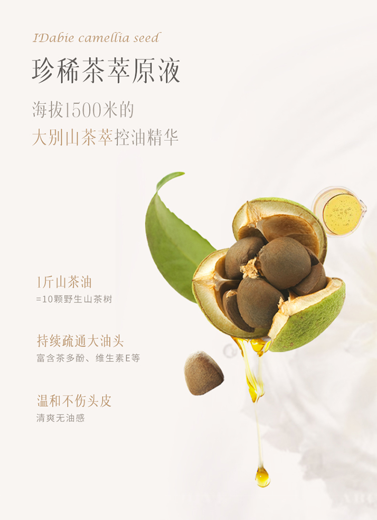 去屑控油,松软净爽,添加茶籽提取物,油腻多屑、暗哑扁塌发质适用
