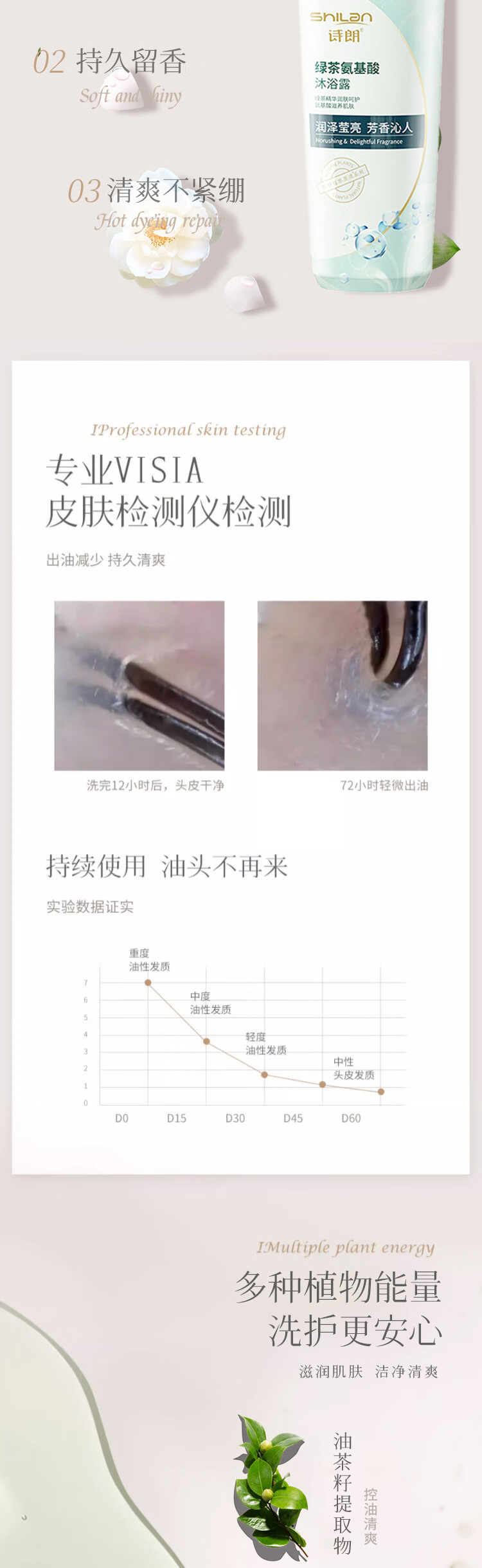 绿茶精华润肤呵护,氨基酸滋养肌肤,润泽莹亮,芳香沁人