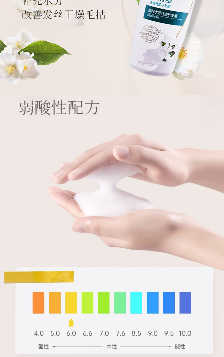 含有茶籽提取物,能够温和去除头皮上的油脂和污垢,彻底清洁头发和头皮,使头发清爽不油腻。