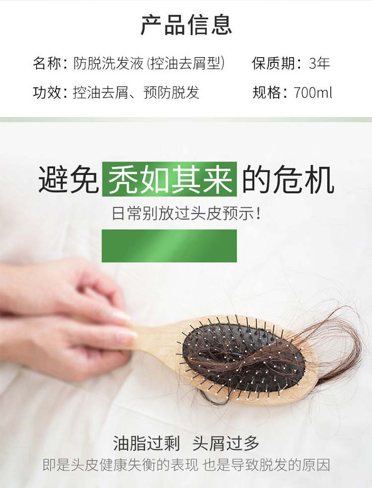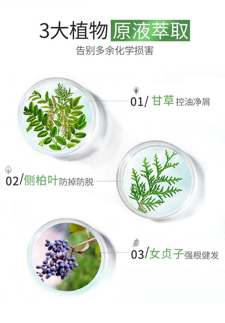 富含甘草、侧柏叶、女贞子植物原液萃取精华,控油去屑,洁净头皮环境,解决致脱因素,补充毛囊营养,修护失衡头皮