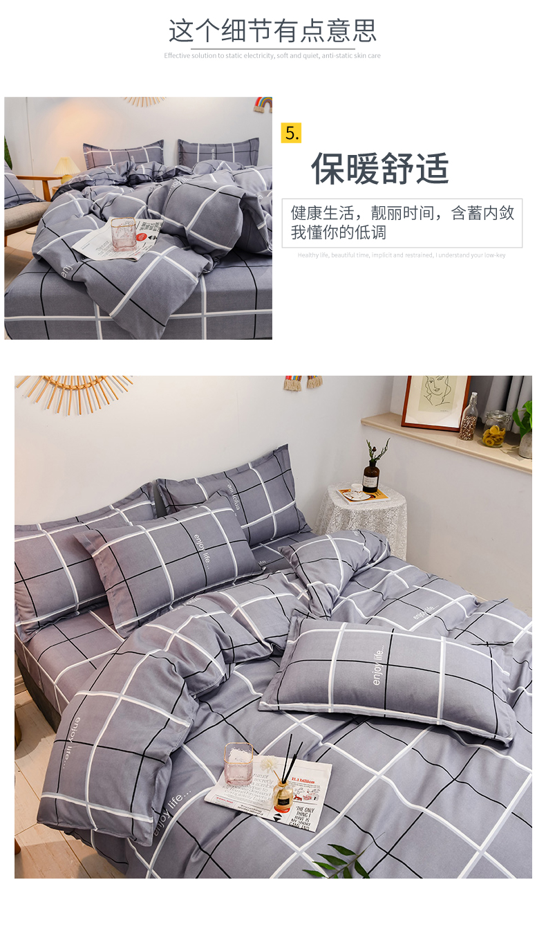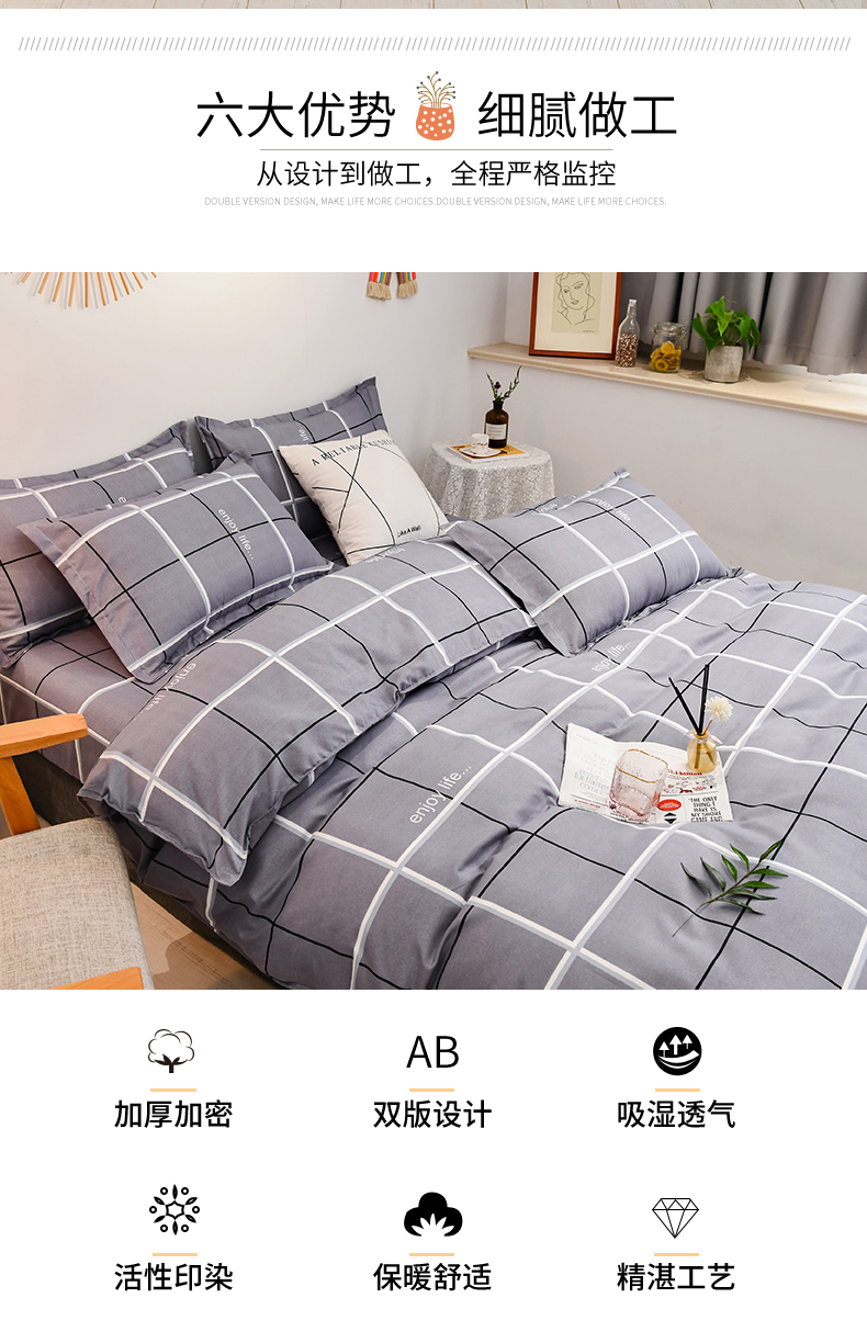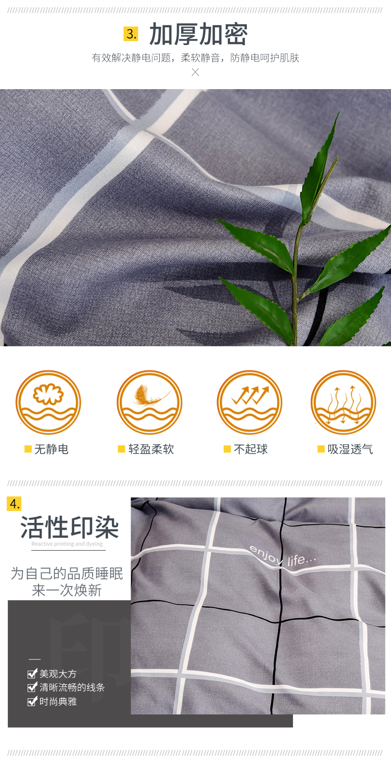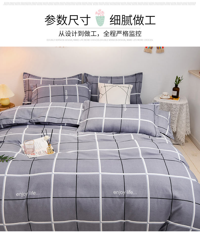 舒适的面料,亲肤又透气,在夜晚给你最温柔的守护!躺上去,钻进被窝,就像被轻轻柔柔包裹着的感觉,触感软滑,十分亲肤细腻,一觉睡到天亮。小清新印花四件套面料厚实,做过缩水处理,面料挺括弹性强。一套的价格,两套享受,随你的心情自由切换!