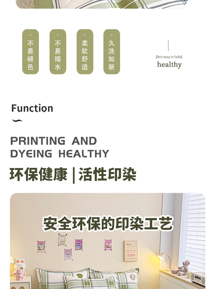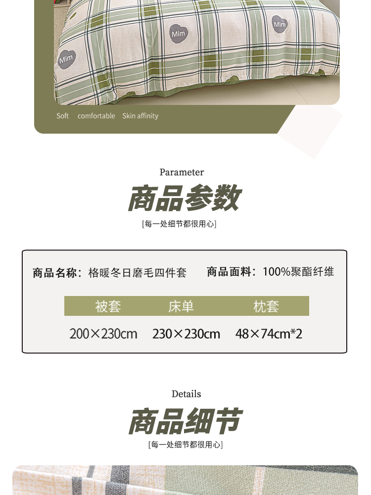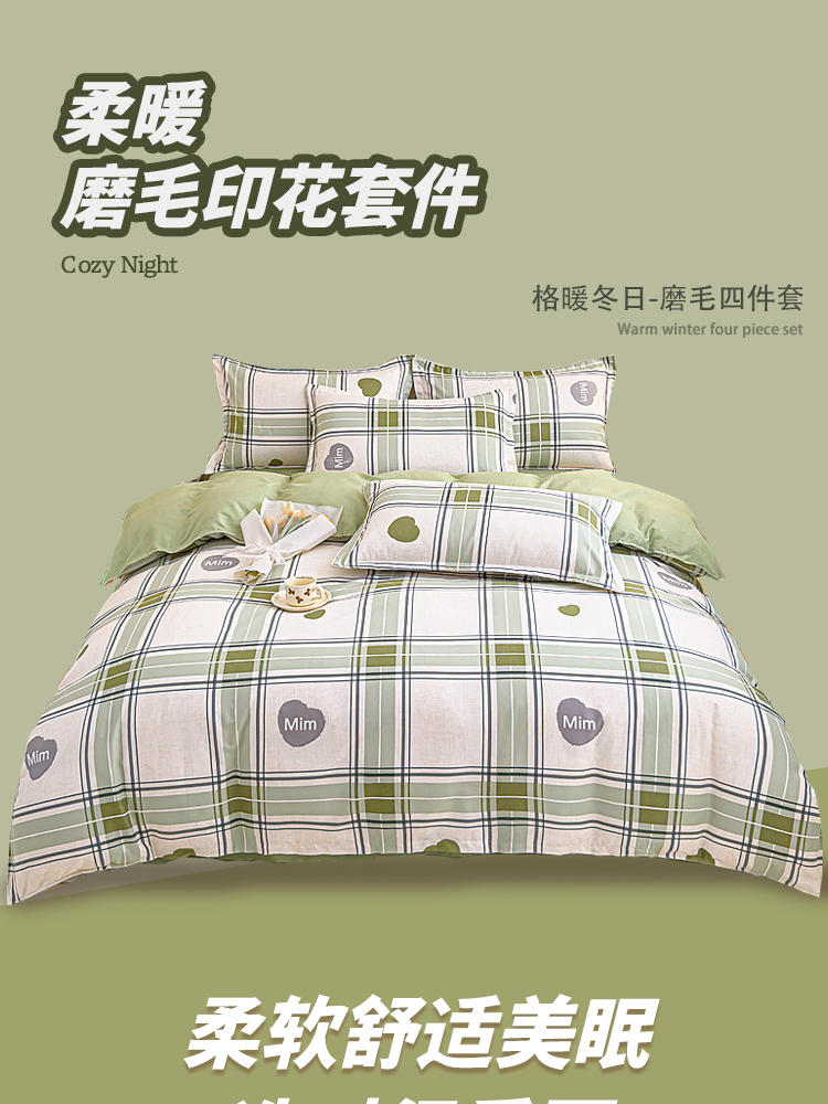 舒适的面料,亲肤又透气,在夜晚给你最温柔的守护!钻进被窝,就像被轻轻柔柔包裹着的感觉,触感软滑,十分亲肤细腻。拥抱这套磨毛四件套,就像投入了云朵的怀抱。在这个季节,给床铺添上一份温暖的守护,加厚不是为了隔离寒冷,而是为了拥抱舒适的冬日暖阳,每一根细丝都经过磨毛处理磨毛四件套面料厚实,做过缩水处理,面料挺括弹性强。