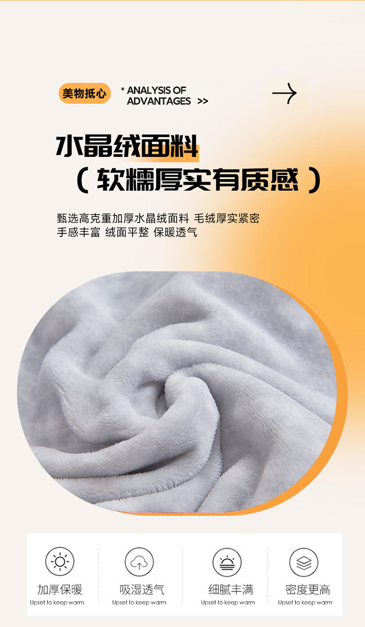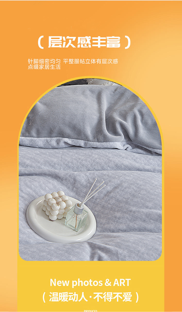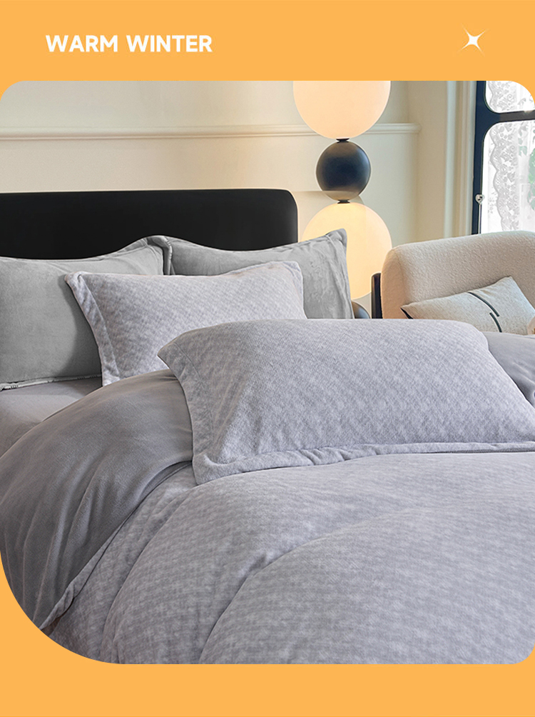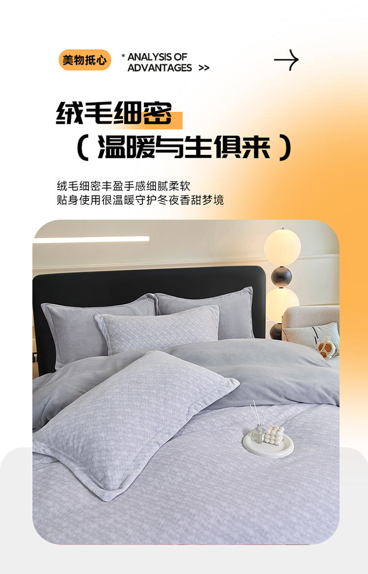 采用100%聚酯纤维面料,经过特殊拉绒工艺处理,绒面蓬松厚实,形成空气隔热层,有效锁住体温,抵御寒冬冷气,让被窝整夜温暖如春,告别手脚冰凉。聚酯纤维结构紧密但透气性佳,搭配蜂窝状织法,既保证保暖性又避免闷热感,湿气快速排出,减少夜间出汗粘腻,舒适度远超传统法兰绒。材质抗皱免熨,久用不易变形起球,机洗后仍能保持蓬松柔软;防静电处理减少毛发灰尘附着,秋冬换季收纳方便,省心更省力。无荧光剂、无甲醛,敏感肌可安心使用;加厚床笠款贴合床垫不移位,被套四角绑带固定被芯,保暖不钻风。寒冬御寒必备——高性价比的聚酯纤维绒套件,用科技温暖替代厚重压迫感,让冬季睡眠质量提升50%!