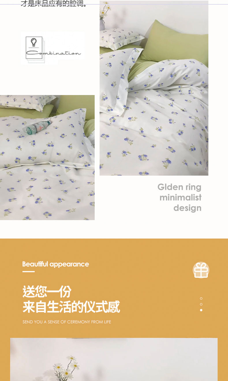淡雅清新的小碎花,让平淡的生活多一丝趣味。柔软亲肤,不掉色不起球。形式上的意与美,打破传统纯色床单的单调与沉闷感,每一处设计都是小心机,时尚又不乏格调,轻松提升卧室品位。"