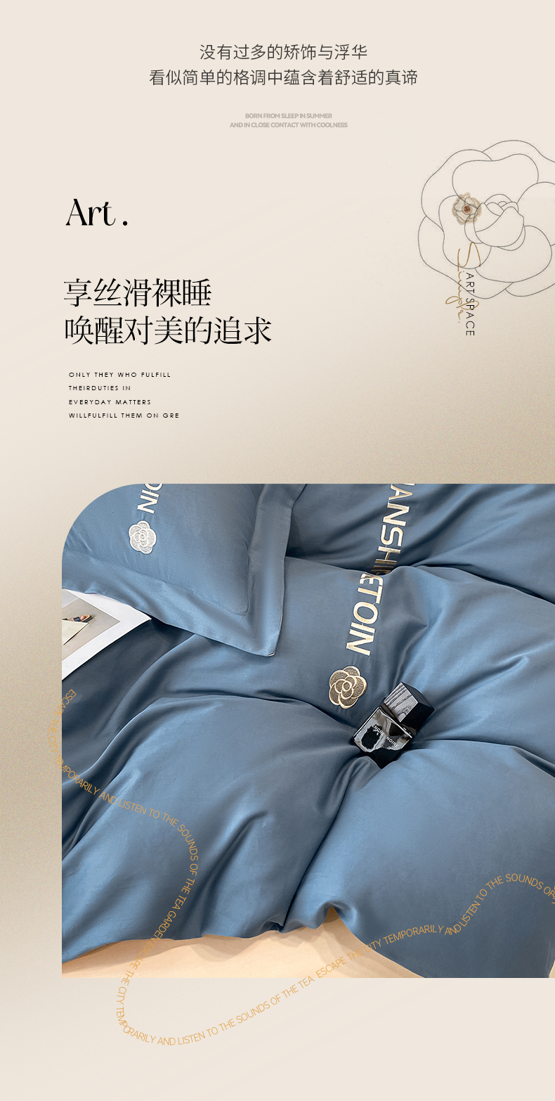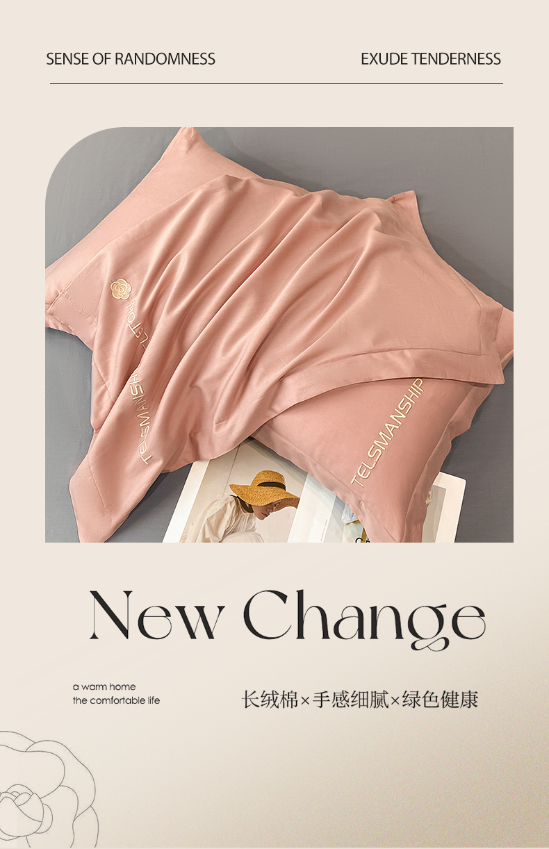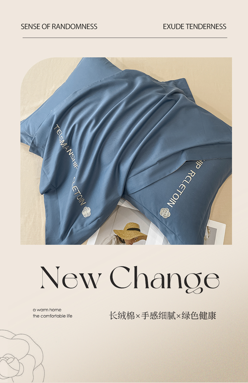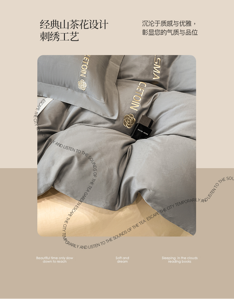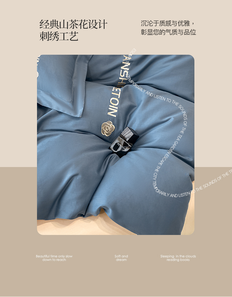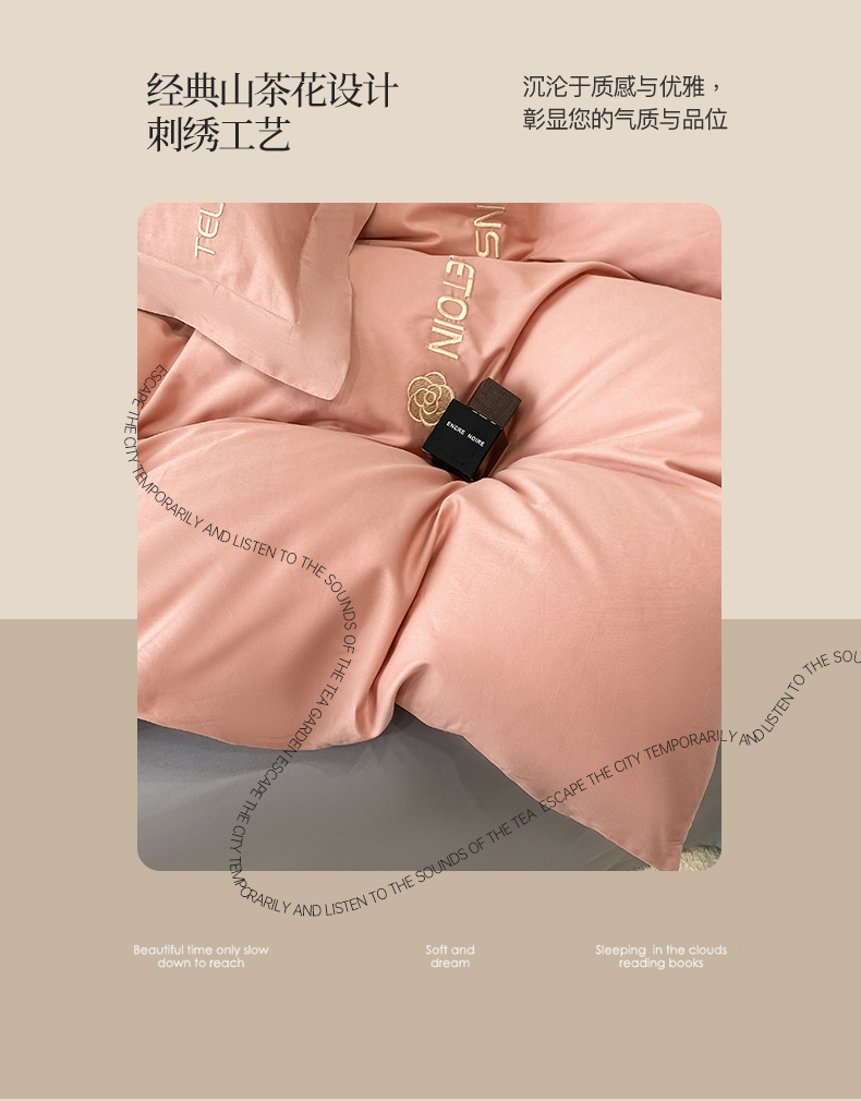 甄选高品质60支新疆长绒棉,平均生长周期比普通棉长10-15天,棉花更洁白饱满蓬松,无荧光,无甲醛,零污染生长环境,触感丝滑细腻,如丝如缎,泛着雅致的光泽感,不落世俗,时尚而尊贵。简约纯色风,精美山茶花刺绣,格调气质之选。