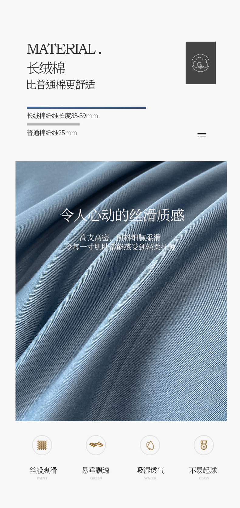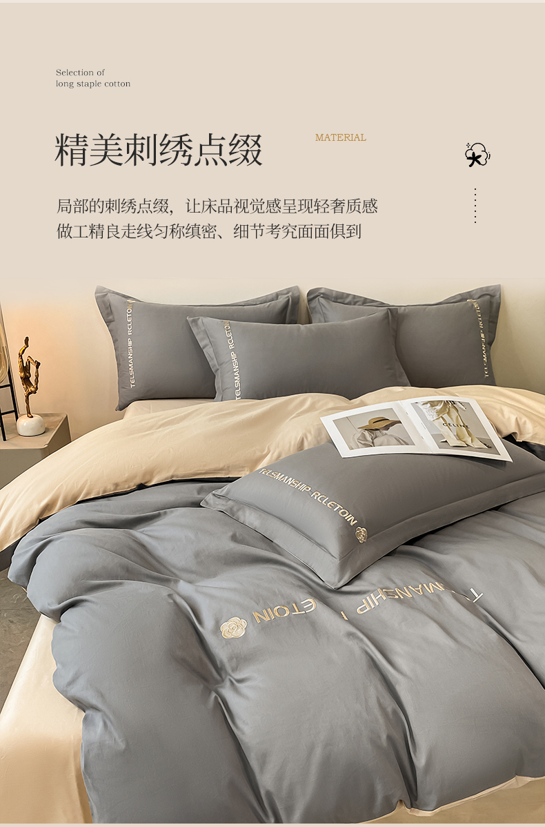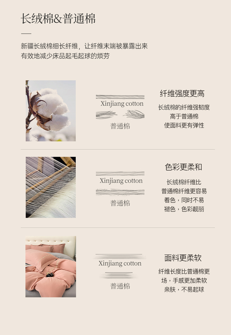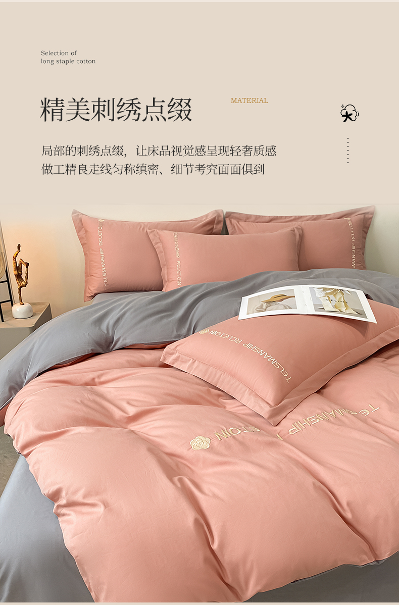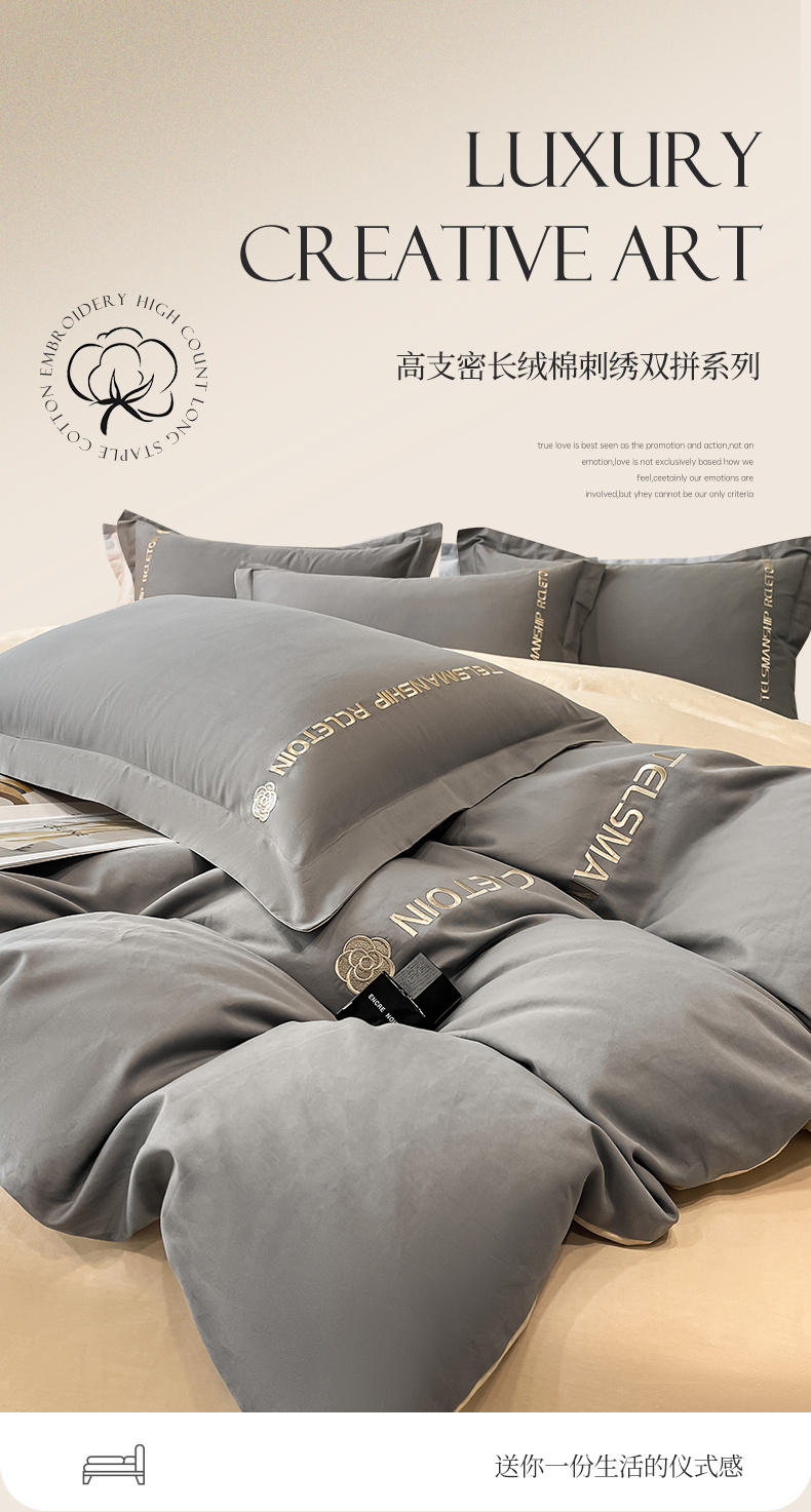 甄选高品质60支新疆长绒棉,平均生长周期比普通棉长10-15天,棉花更洁白饱满蓬松,无荧光,无甲醛,零污染生长环境,触感丝滑细腻,如丝如缎,泛着雅致的光泽感,不落世俗,时尚而尊贵。简约纯色风,精美山茶花刺绣,格调气质之选。