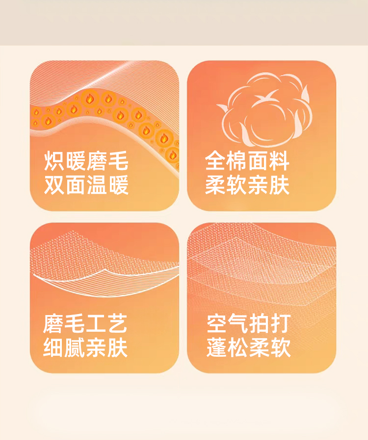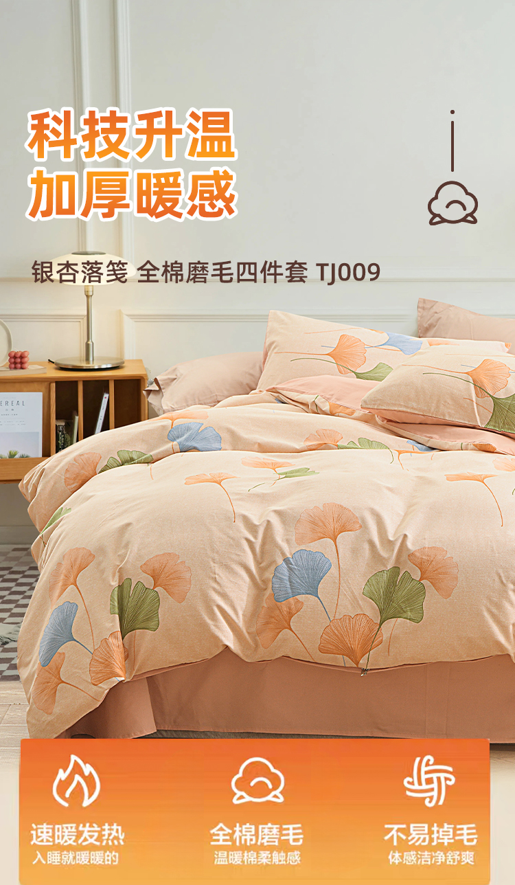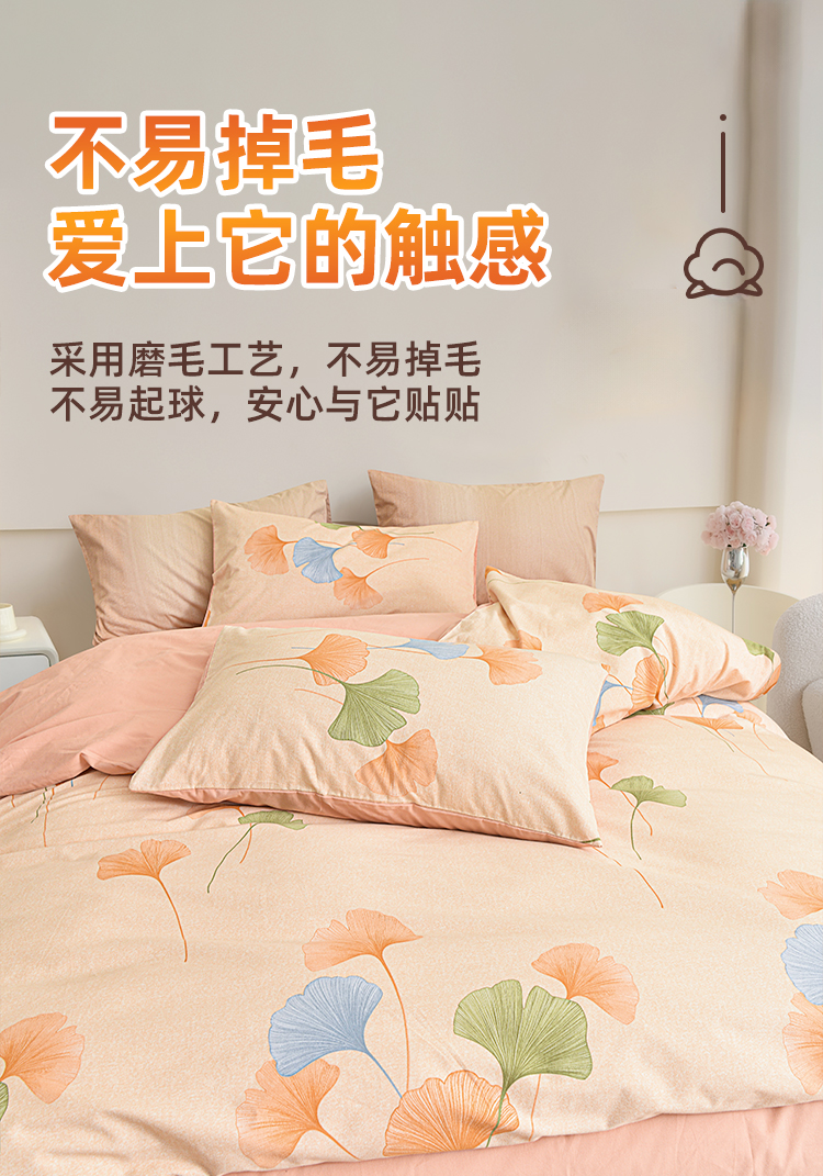 银杏落笺全棉磨毛四件套以自然美学与实用科技为核心,打造「会呼吸的温暖」睡眠体验。精选100%优质棉,经双面磨毛工艺形成细腻绒层,触感如初雪融化般绵软,秋冬裸睡不凉肤,春夏透气不闷汗。设计上提取银杏叶脉纹理,采用活性印染工艺呈现渐变暖棕色调,搭配隐线包边细节,既保留自然野趣又彰显现代极简格调。被套被角带设计防移位,经多次水洗测试仍保持柔软如新,让每一夜都沉入银杏色的温柔梦境。