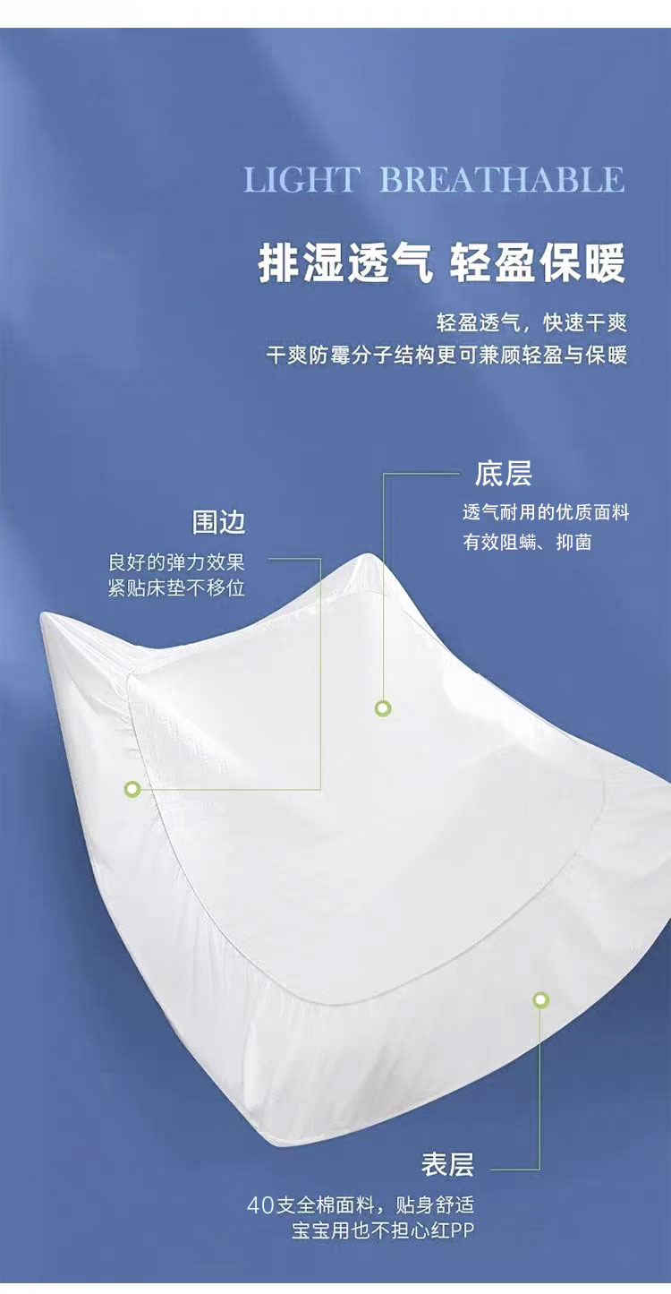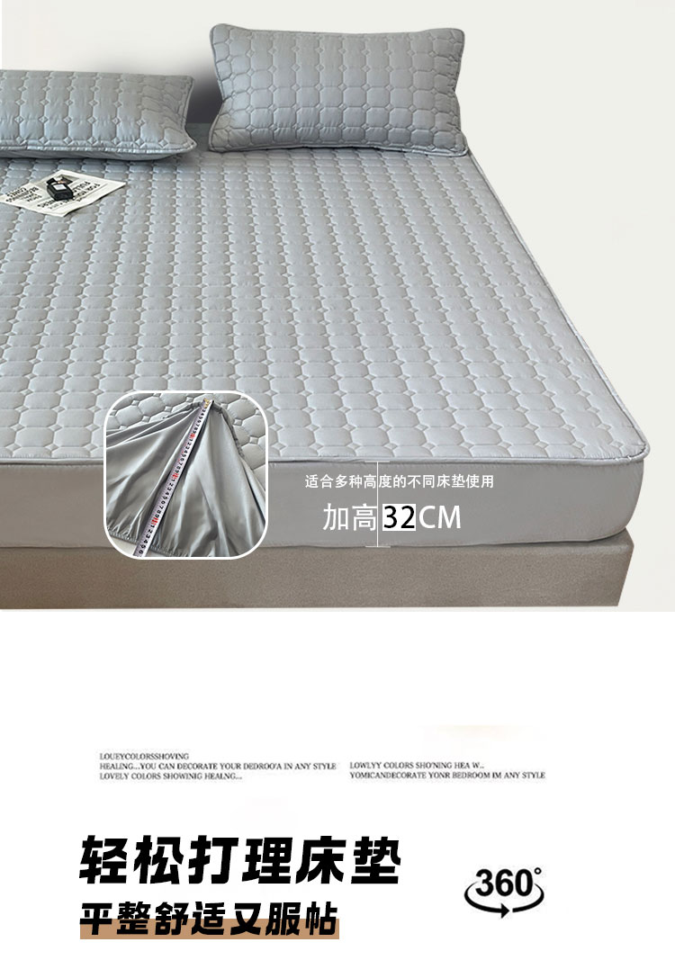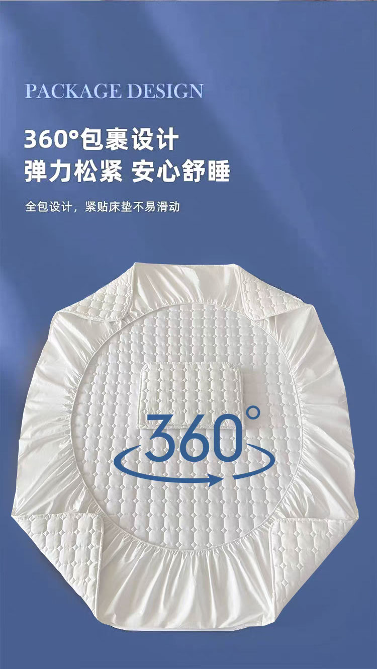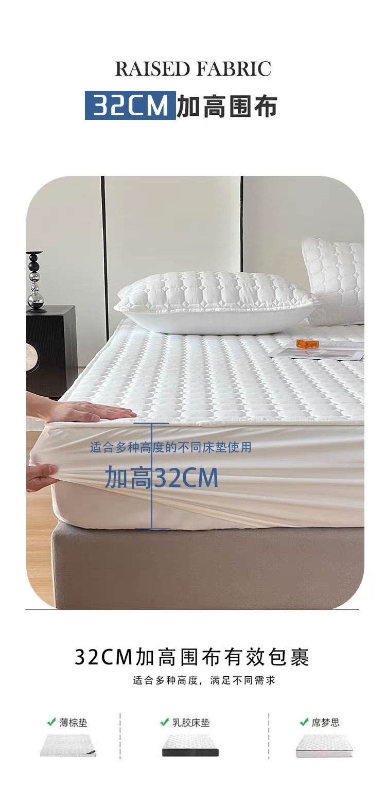 采用优质全棉面料,触感柔软细腻,亲肤性极佳,可抑制螨虫滋生,对敏感肌肤友好。天然棉材质透气吸汗,能保持睡眠环境干爽,避免闷热潮湿,提升睡眠舒适度。床笠式360°全包围设计,整圈松紧带包裹,稳固不移位,有效阻挡灰尘、污渍、油渍等侵入床垫,日常的饮品泼洒、灰尘堆积都能被床笠隔离,减少床垫清洁负担。32厘米加高床围,适用绝大多数床垫,轻松包裹无压力。