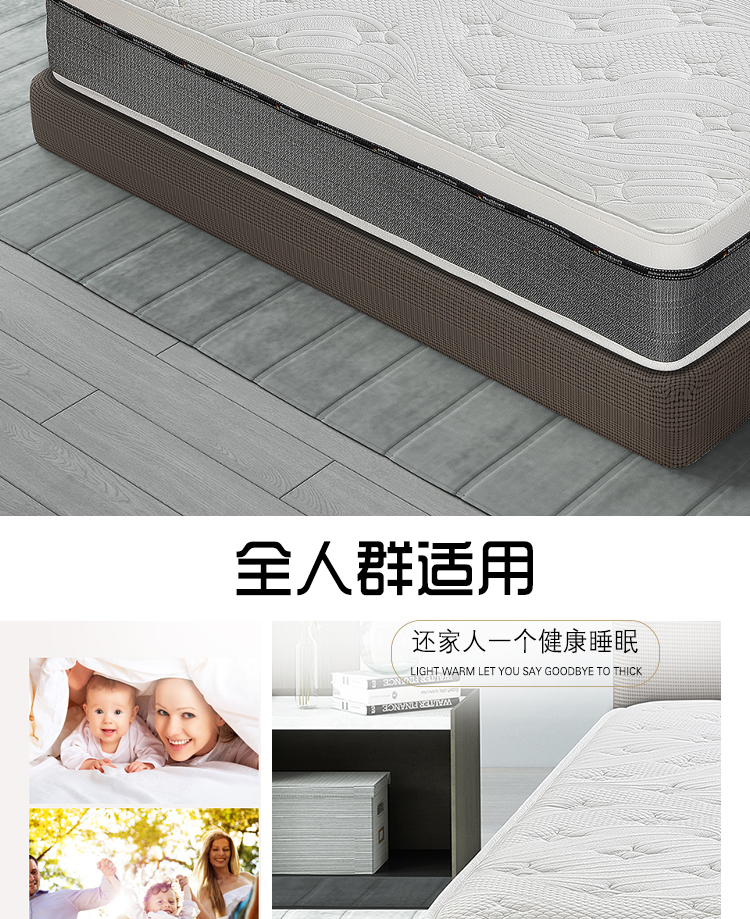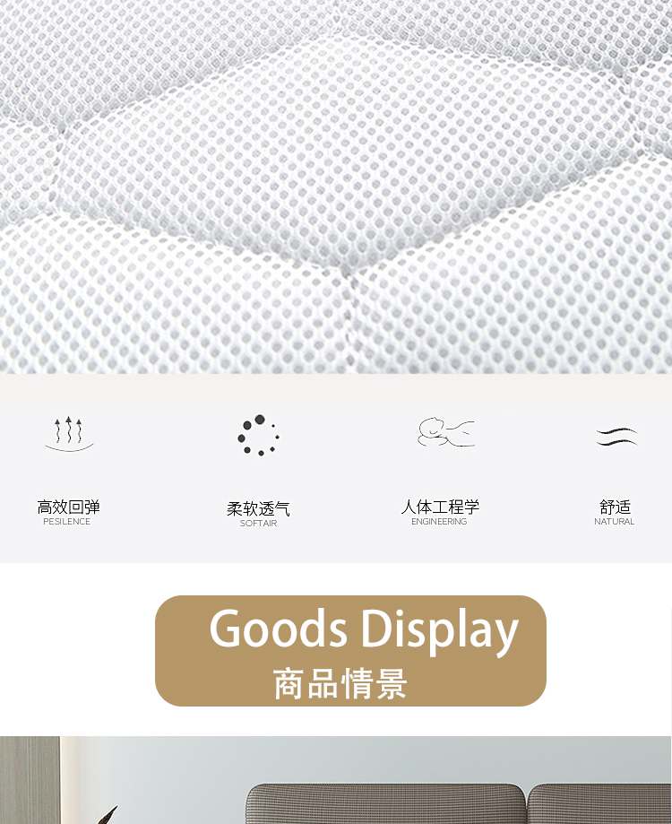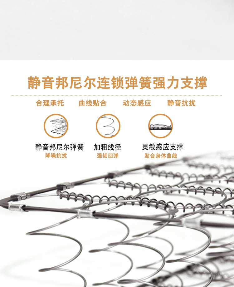采用天然乳胶材质,柔软亲肤,贴合人体曲线,分散压力,带来云端般的舒适睡感。静音邦尼尔连锁弹簧强力支撑设计,精准支撑身体各部位,有效缓解颈椎、腰椎压力。透气性极佳,蜂窝状结构促进空气流通,保持干爽。高弹性材质经久耐用,抗变形能力强,静音效果出色,翻身无噪音干扰。无论是上班族、老年人还是儿童,都能享受健康深睡体验。环保工艺,无有害添加,搭配人体工学设计,让每晚睡眠都成为身心放松的治愈之旅。