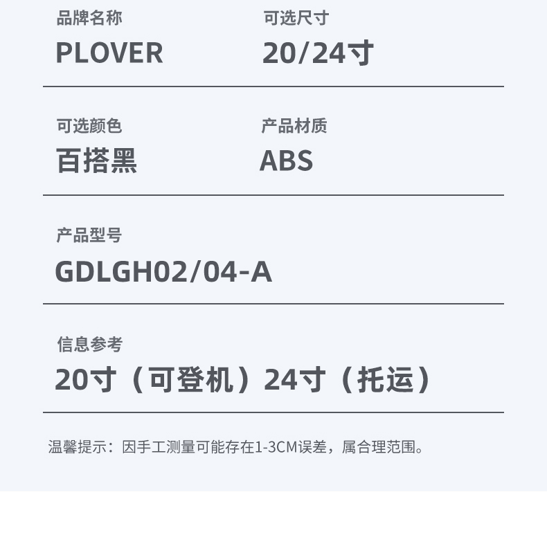 PLOVER香港啄木鸟20英寸简约登机箱拉链款拉杆箱 GDLGH02-A/24英寸GDLGH04-A